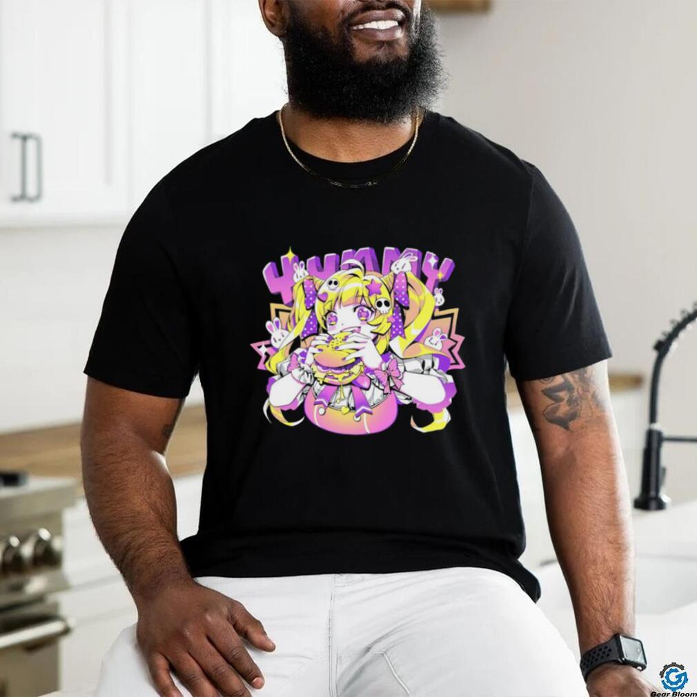 Anime girl eating a big juicy hamburger Yummy cartoon shirt