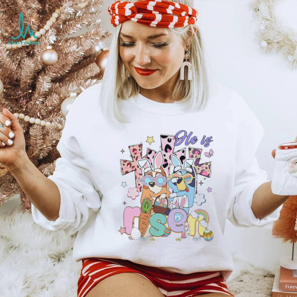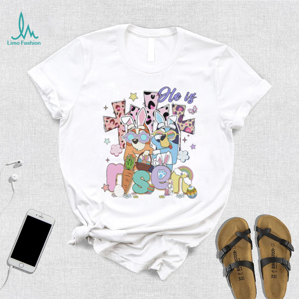 The first thing you need to do to prepare is contact all of your suppliers to learn their plans for the Bluey characters He is Risen Easter day shirt. It’s entirely possible they’ll list this important information on their websites or send it out in a blast email, but don’t rely on this. Take control of your store and get this important information yourself. Make a master document that contains all of your suppliers, when they’re planning on shutting down, for how long, and to what degree. You’ll find that some suppliers are only shutting down for a week and will still be contactable for questions. Others though may be closed for an entire month and truly shut down, meaning impossible to contact (though this is rare). It’s important to understand the holiday policies of all of your suppliers so that you can effectively manage your offerings and customer expectations during the weeks surrounding the holiday. When seeking this information, remember the likely communications delays you’ll face and make sure you start this process as early as possible. You want to give your suppliers ample time to get back to you.