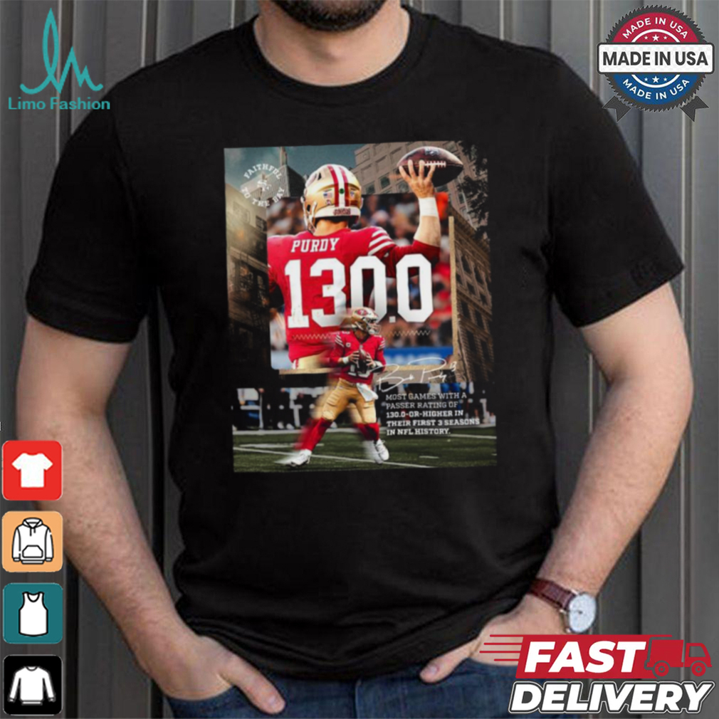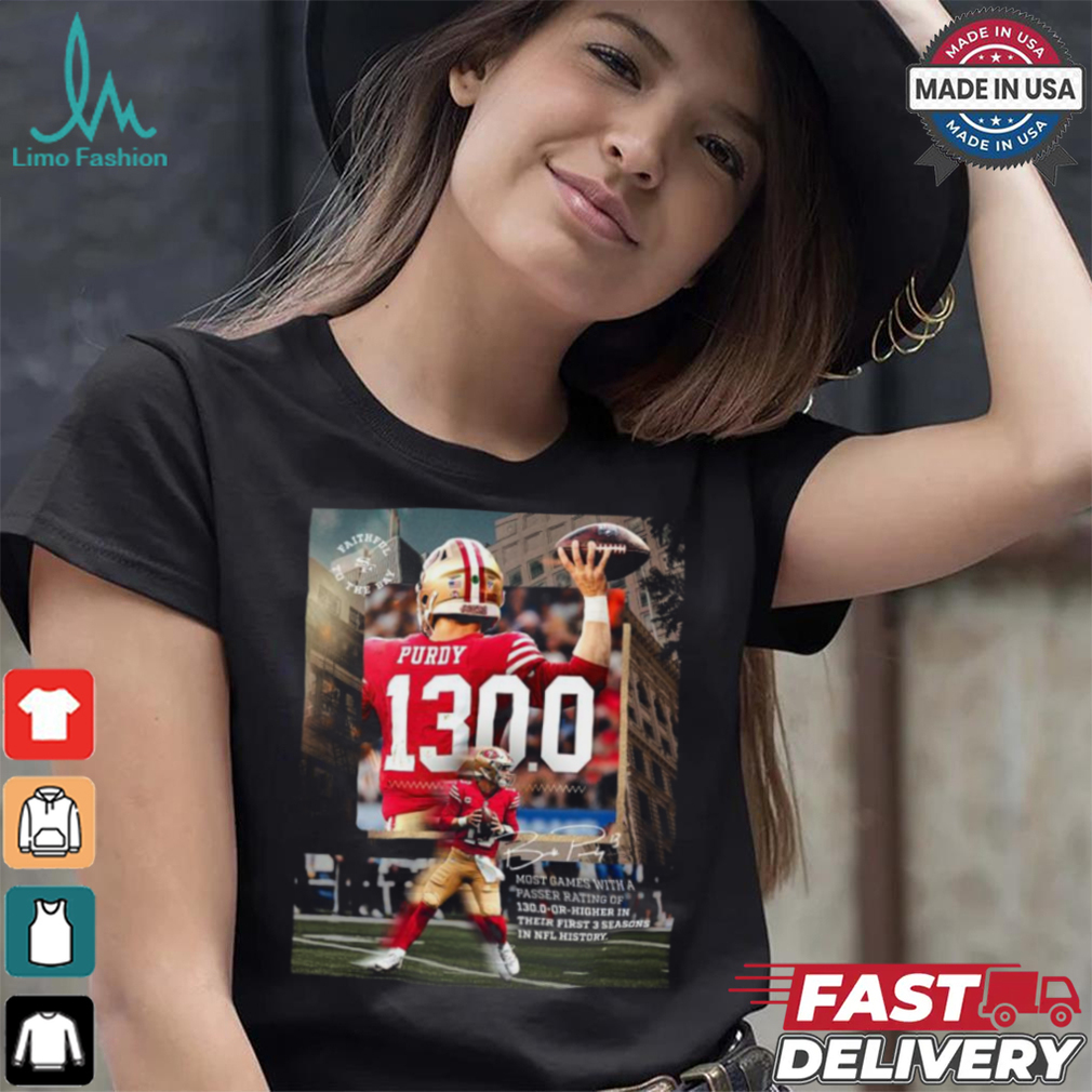The first thing to know is that the Brock Purdy San Francisco 49ers 130.0 Or Higher In Their First 3 Seasons In NFL History Shirt of Matthew’s Gospel used the Greek word magi, which does not actually mean ‘wise men’, but is a reference to the priests of the then-great Zoroastrian religion of the Persian Empire. When Matthew says they came from the east, he was alluding to the direction of Babylon and Persia. It is, of course, inconceivable that Zoroastrian priests would be in the least interested in the birth of a purported king of Judah. It is scientifically inconceivable that a star could be followed so accurately to Jerusalem and then to Bethlehem and actually stand over the very house where Jesus was. However, our author (he was anonymous and very unlikely to have been called Matthew) knew that the magi were well known for their wisdom and for their knowledge of astrology, so he knew this nativity account would be plausible.