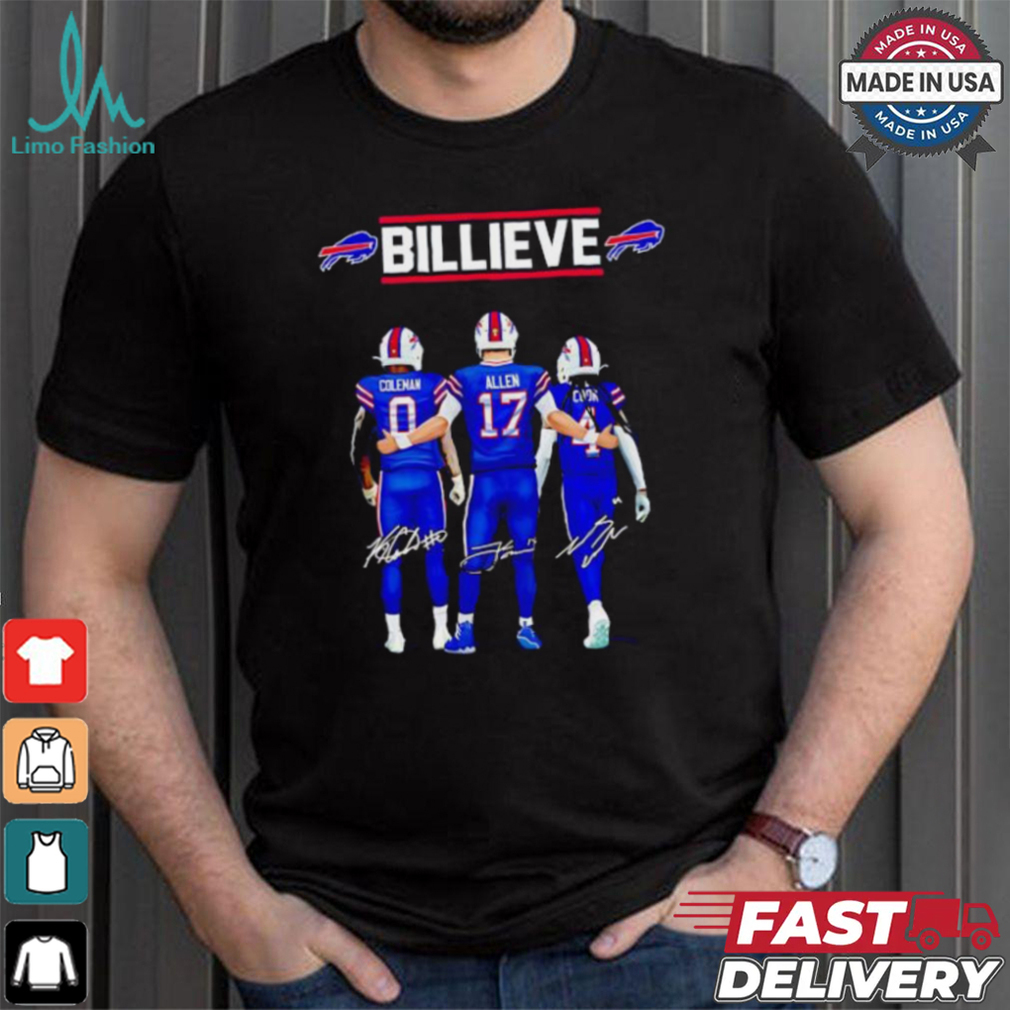 Simply look at Steve Jobs, the guy who ran Apple so well. He was a Buffalo Bills Coleman Allen Cook billieve signatures shirt believer in “natural” medicine, in fact he wouldn’t bathe since he felt this somehow or other weakened him but his fellow workers had lots of problems with this. He developed Pancreatic Cancer nothing may have done him any good but from the little that I’ve found on his case he may have had a rare case, like Ruth Bader Ginsberg, where prompt surgery may have saved him. He wanted to try some “natural treatments” first, he did, and you know how that turned out. Just because you know a lot about a lot of things don not assume that you know everything about everything. He was in many ways a brilliant man in most areas but not in the treatment of pancreatic cancer. The worst part is he got a liver transplant later on when he decided to try regular medicine, something that might have saved someone who really needed it. So sad.