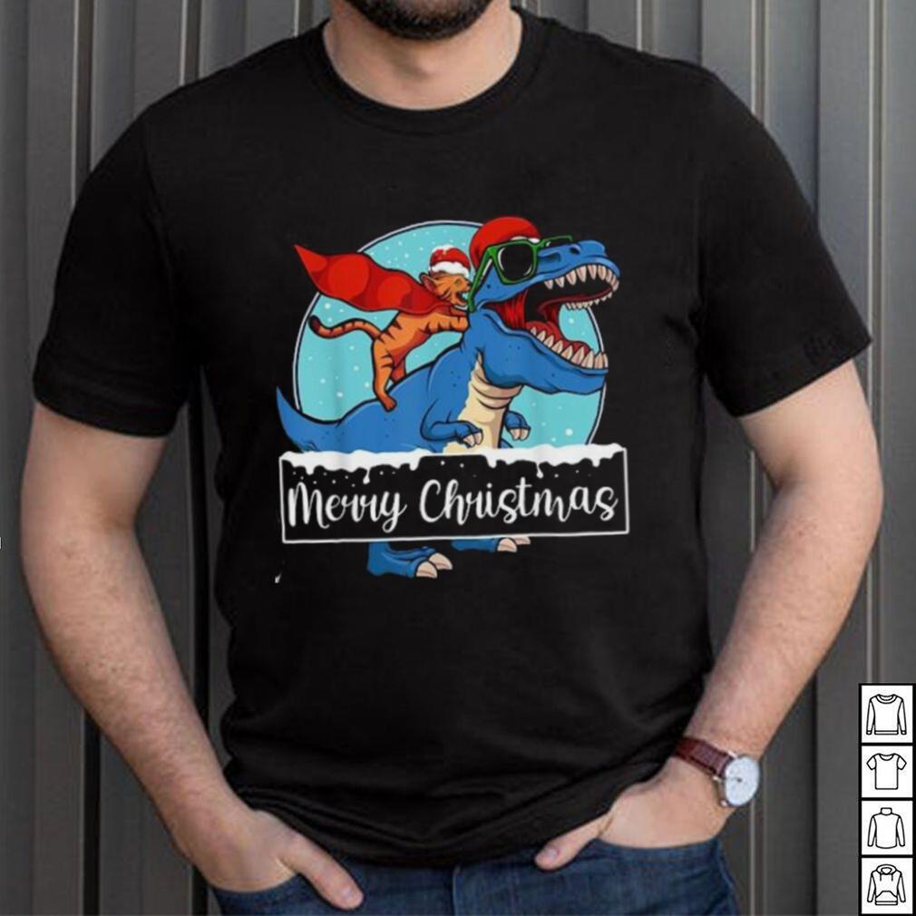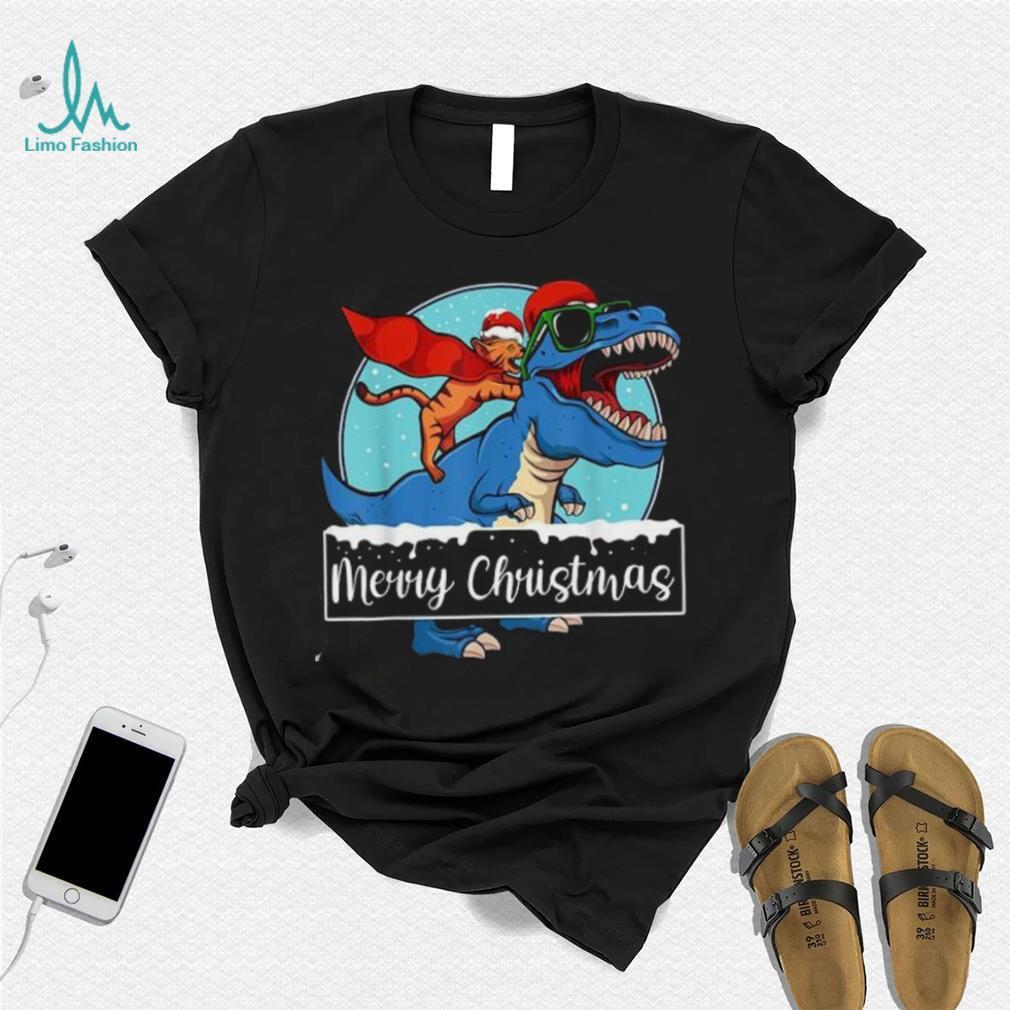 Cat Riding Dinosaur Christmas Pajama Cute T Rex Santa Hat Shirt
