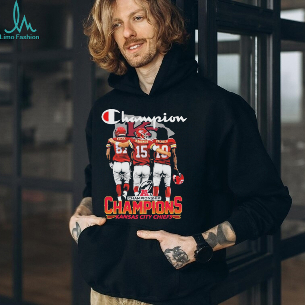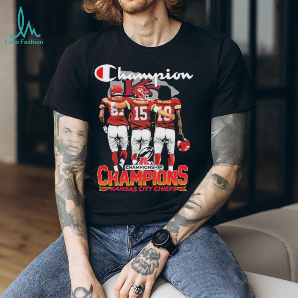 ()Champion Travis Kelce Patrick Mahomes And Isiah Pacheco Kansas City Chiefs AFC Champions Signatures Shirt, Hoodie, Sweater, Vneck, Unisex and T-shirt