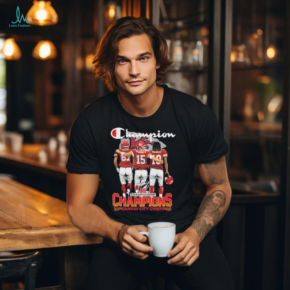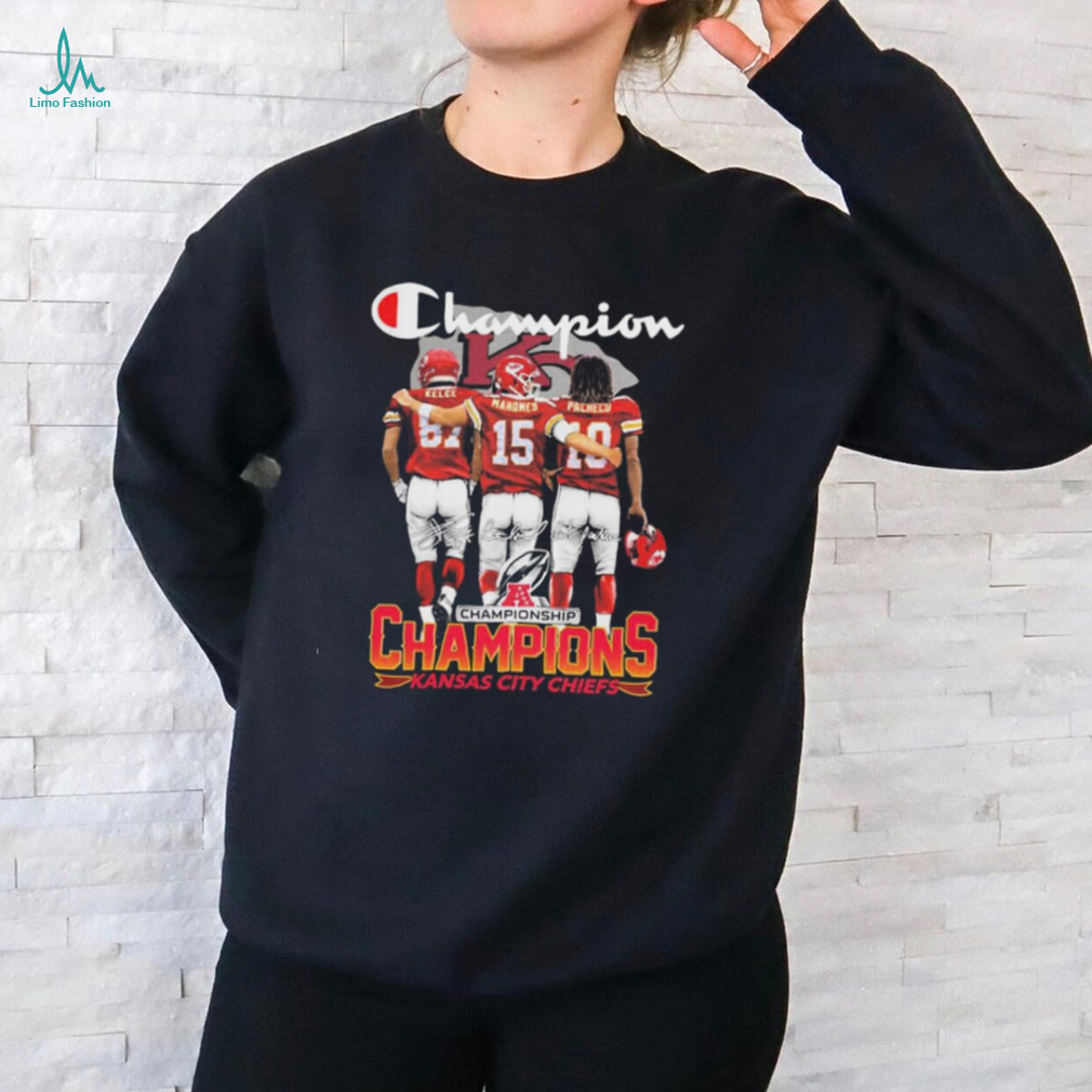 The Champions Travis Kelce Patrick Mahomes and Pacheco Kansas City Chiefs signatures shirt to answering your question is experience. We exist to experience; we know we exist because we experience our own existence. The second key is observation. We observe our existence, our experience. We witness, record, and reflect upon our experience. The third key is intention. From observations of our experiences, we build a theory of “reality”, and make choices to act or not act based on that theory. We form an intention to create a specific experience that we want to observe. Now we have a sufficient solution to the problem. Experience, observation, and intention together create reality. They cannot exist without each other. None is more fundamental than the other, and none can be removed without destroying the others. Experience, observation, and intention: the grand experiment. We exist to try things, experience them, and observe the result. There is no meaning beyond that; when we are gone, all those things are gone too. We should use the little time we have to make as many experiments as possible. We have been blessed with the opportunity to experience, observe, and intend, and we should not waste it.
