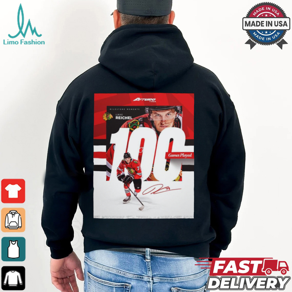 Chicago Blackhawks Milestone Moments Lukas Reichel 100 Games Played Signature Poster t shirt hoodie, tank top, sweater and long sleeve t-shirt