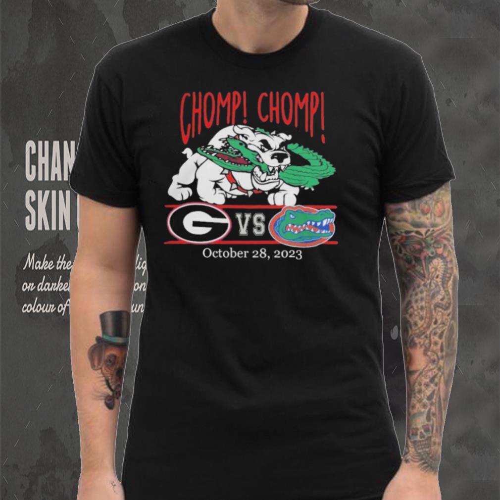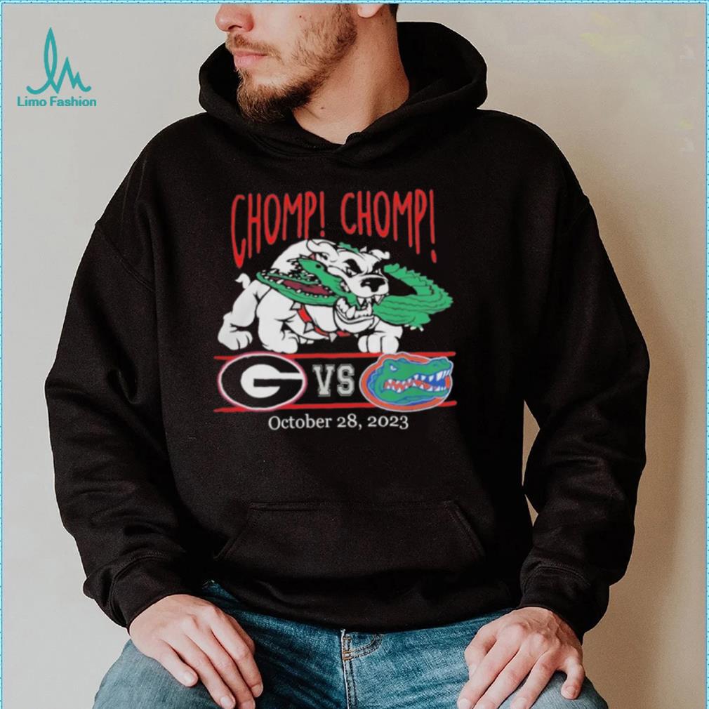 My funny story is when Santa put himself on the naughty list. I travelled the Chomp Chomp Georgia vs Florida October 28, 2023 Shirt home from work a few years ago, and I enjoyed all the Christmas lights and decorations every night. One house had a huge blow up Santa on top of the garage, with his arm raised, waving at you when the wind blew. One day I left work early, and it was still daylight. As I turned the corner on this windy day, I saw Santa was a bit deflated. He was slightly bent over and his arm had fallen down so that his hand was between his legs, and the wind was blowing a bit, and he was gently bobbing up and down, up and down, and he seemed to be enjoying himself entirely too much! I was crying with laughter, and I can never look at Santa again without flashbacks.