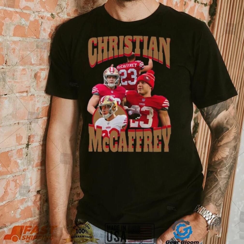 Union Square offers soft Christmas Carols in the Christian Mccaffrey 90s Nfl Essential T shirt a Twenty feet tall, lavishly decorated tree with lights as a center piece in the square. This is surrounded by an Ice Skating Rink which is available seasonally. The Union Squarw Park Plaza is centered in the shopping area bordering Maiden Lane, an exclusively designer brand store lined roadway. Other shops and department stores such as Saks Fith Avenue, Tiffany’s, Nike Town, Apple, Nieman Marcus, Louis Vuitton, Macy’s, Swarvoski Crystal, and many others. Another attraction is the historical Westin st. Francis Grand Hotel which is directly across from the Powell side of the square. You might want to check out the Sony Metreon center at the corner of Forth and Mission. There is a park and plaza area behind the center for rekaxing and people watching. It also shares the block with the Moscone center. City Hall, located at the Civic Center also features a pretty lavish Christmas exibit. Hope this helps.