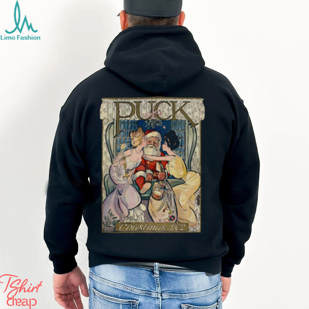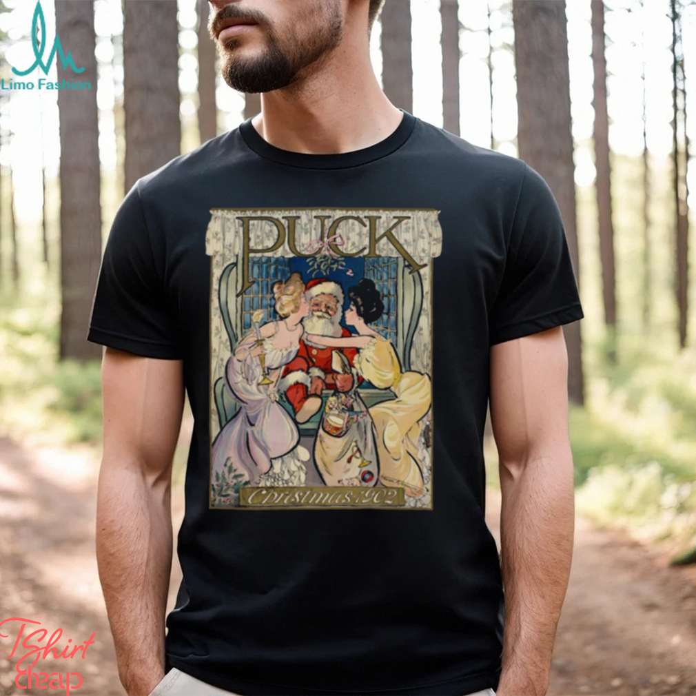 The English term Christmas (Old English, Cristes maesse) is actually of Christmas Puck Kissing Santa shirt recent origin: the feast day only began to be widely celebrated with a specific liturgy (the Cristes maesse) in the 9th century. The earlier term Yule, from the Germanic jōl or the Anglo-Saxon geōl, referred to the feast of the winter solstice, and made no mention of Christian church liturgy or practices. On Christmas Day, the Church traditionally celebrated three Masses. The first of these took place at midnight and celebrated of the actual birth of Christ. None of the contemporary Christmas customs have their origin in these liturgical affirmation (or masses), and most are of a much more recent date. The exchange of gifts originally took place in the early hours of the 25th when people returned home from the first, midnight mass. When it became customary to open gifts later in the day, the times of many church services were altered – another example of how far from the idea of the liturgical ‘Cristes maesse’ the holiday has come.