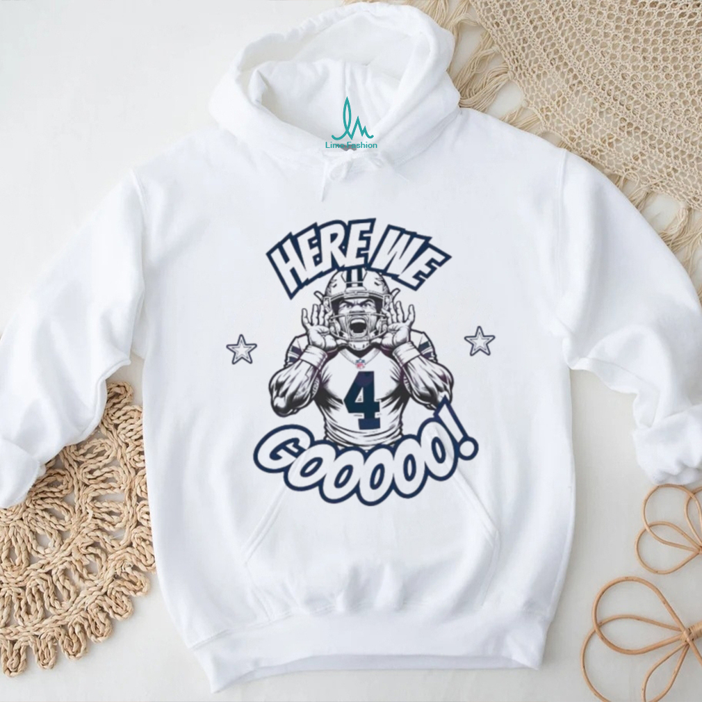 Flowers and Dak Prescott Here We Go Cowboys Shirt ornamentals that have grown well at our place include lupine, tansy, golden rod, perennial sweet pea, Queen Anne’s lace, prairie mallow—and a whole host of other beautiful native wild flowers, also phlox, daisy, lilies and day lilies, (the Easter lily I planted regularly grows to 5 or 6 feet high), hostas (for some reason, deer don’t seem to bother the hosta until the fall when I’m happy to have them trim down the plants for me), autumn clematis, autumn crocus, iris, peony, and sunflowers, which do well, but usually bloom after we’ve left. Again, these are plants that do well on their own. I uncover, weed around them at the beginning of summer and then leave them to grow and bloom on their own while I swim, hike, read—vacation home!