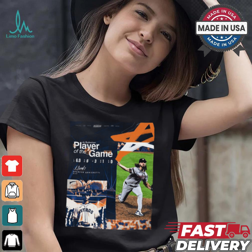 At this point Mephistopheles returns and Beethoven informs the Design Spencer Arrighetti Houston Astros Player Of The Game RHP 2024 Signature shirt that he will not allow his music to be destroyed. Desperate to receive the Tenth Symphony, Mephistopheles makes another deal: if Beethoven will give over only the Tenth Symphony, then Mephistopheles will not take the composer’s soul. After an appearance by Mozart’s ghost, Beethoven refuses this offer as well. As a final tactic, Mephistopheles points out the window to a young orphan and describes the tortures that she will receive if Beethoven refuses to hand over his music. Heartbroken, Beethoven agrees to hand over his Tenth Symphony. After Twist’s prompting, a contract is drawn up by Fate stating the following.