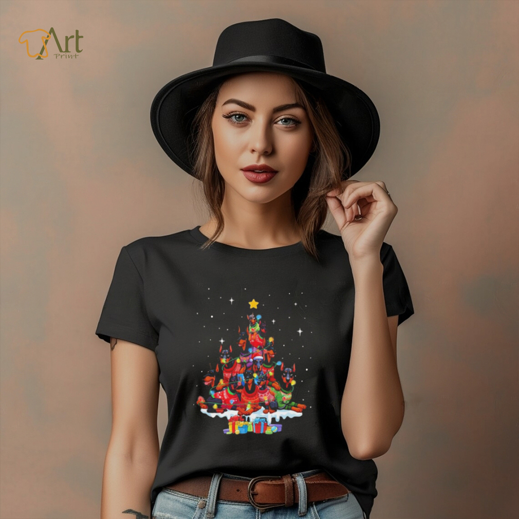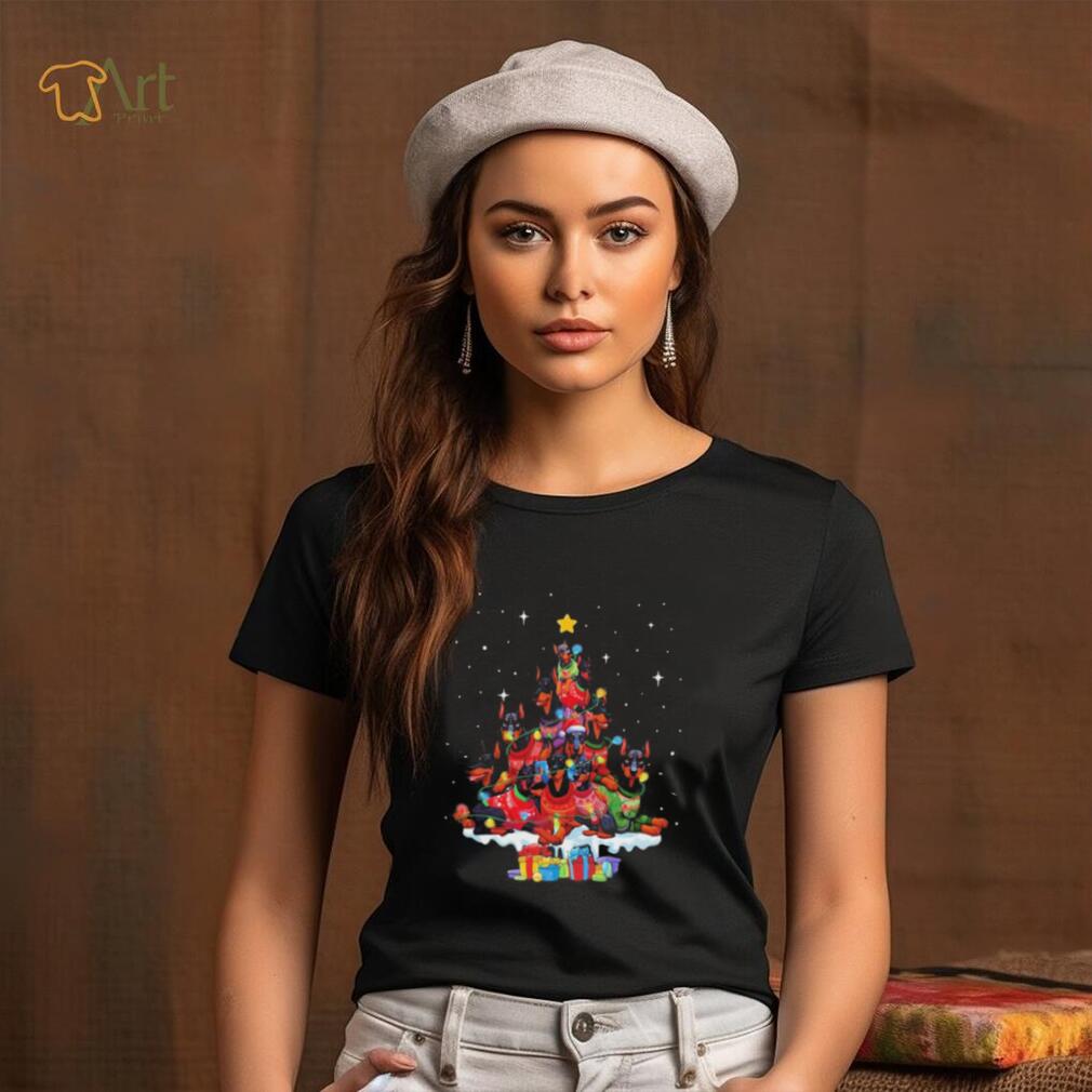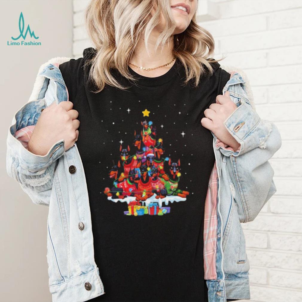 Its increasingly harder to get the NFL to commit to what a CATCH actually is (a TD in Chicago can be called a non catch in Seattle, even though the same exact type of Dogs Dobermann pine tree merry christmas shirt catch was made). The main reason for this, the NFL does not hire FULL TIME officials. These are men (and now women) with other jobs that while they are fully trained, do not do this full time as their main work. Further more, NFL officials work together as teams during the regular season. The Playoffs for Referees is just like for the rest of the NFL..the best of the best get to join in. That means you have Line Judges from one team mixed with Referees from another team, because those two people graded the highest during the season, and their reward is.. to ref the playoffs…and Super Bowl. A lot can be said about team chemistry, and how well a Dogs Dobermann pine tree merry christmas shirt team works together. Well keep that in the Officiating too please NFL. Pick the best TEAMS and keep them together in the NFL.