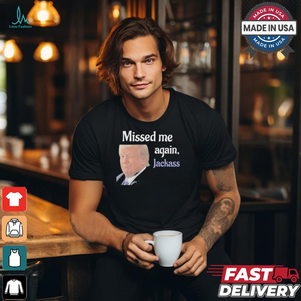 I told her, Well, I just I need to Donald Trump Missed Me Again Jackass Shirt this one who chose me. She gasped, as the kitten was still holding on to me,patiently waiting. He let the girl get him from the cage and then climbed into my arms and looked at me as if to say, “Well? Come on, let’s go home!” I knew then I was beaten! Less than two minutes looking at cats only to be chosen. Gonzo is a dork and also a very good boy. He was fully accepted by the two adult cats in less than a week. He causes chaos daily in the house. I would not trade him for anything! I think he was so smart to chose the biggest pushover in the room! Below of pictures of him as a kitten and now as an 18 pound force of nature.