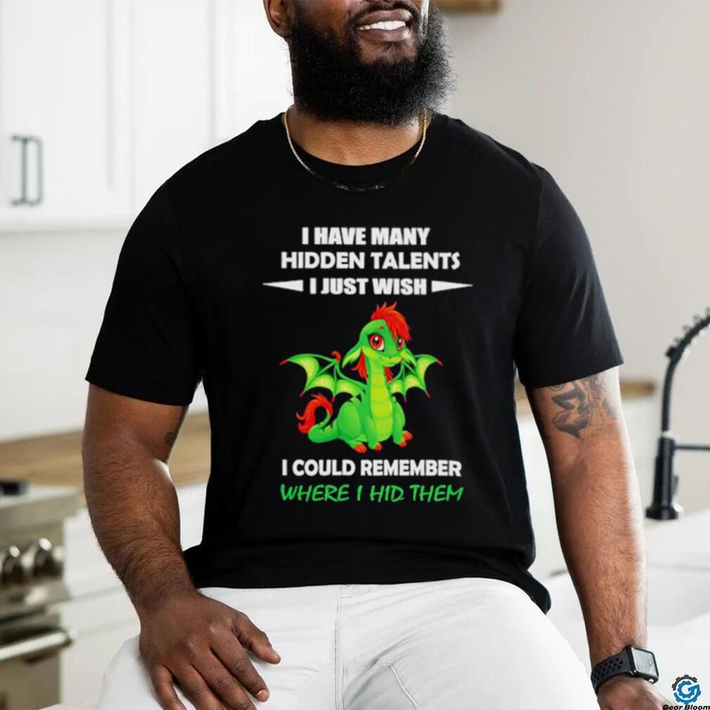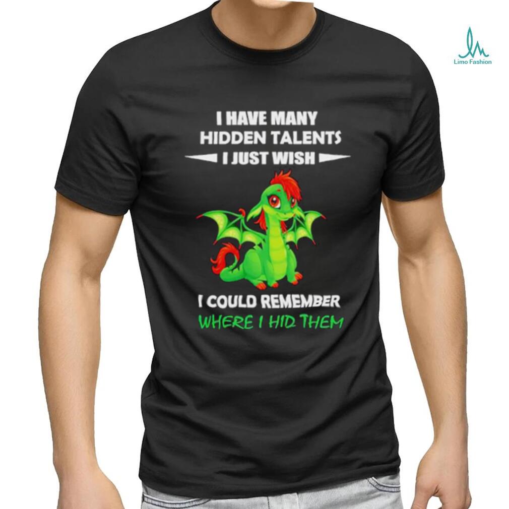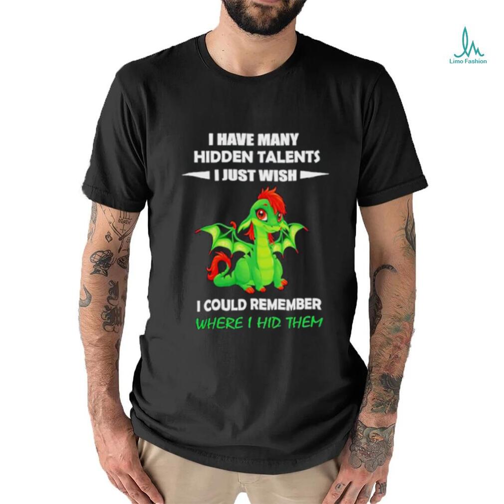 ()Dragon I gave many hidden talents I just wish I could remember where I hid them shirt. Categories of this T-shirt is teejeep, Dragon I gave many hidden talents I just wish I could remember where I hid them shirt from Dadyshirt ✓ Unique designs ✓ Large assortment ✓ Comfortable ✓ High-quality ✓ Easy to care for ✓ Available in a range of colours and styles for men, women ✓ Shop now ✓