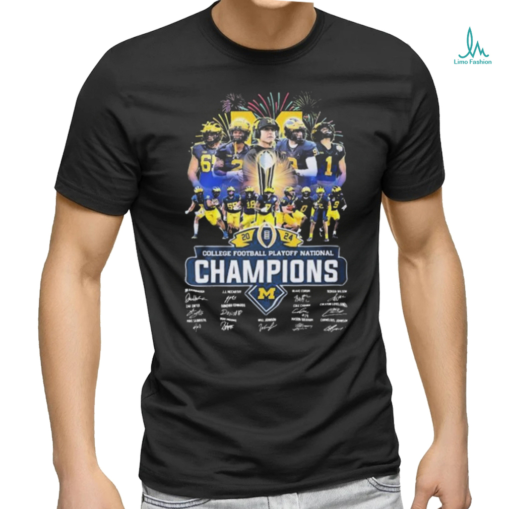 If an hypotetical third invasion would have followed the same pattern of the previous two, the Mongol would lose again. Logistically, having a Fireworks 2023 2024 Michigan Wolverines CFP National Champions Signatures Shirt based army crossing the sea is a nightmare, and this force the Mongol to follow a predictable route to land at the Hakata bay, twice. And despite their strenght, they weren’t able to make any significant victory in Kyushu, but suffered several defeats. So even by a tactical point of view, when the Mongols didn’t have an obvious numerical advantage, they lost all of their battles, like at Akasaka, Torikaigata or Mikuriya. The role of the kamikaze has been overblown by the defeated mongols and by the japanese clergy; in the first invasion, there is no mention in japanese sources of any storm, and in the second one, it was a final blow to an already defeated army.