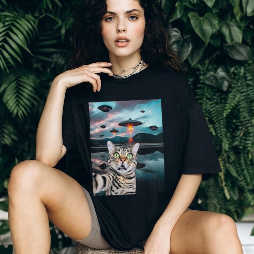 Funny Cat Selfie with UFOs1 is a must-have for any Funny who loves all things teejeep. These shirts typically feature popular Trenđing Shirt characters, quotes, or logos, and come in a range of styles and colors to suit any taste. Some designs may even feature the dad’s favorite Trending or characters, making them a personalized and thoughtful gift.
