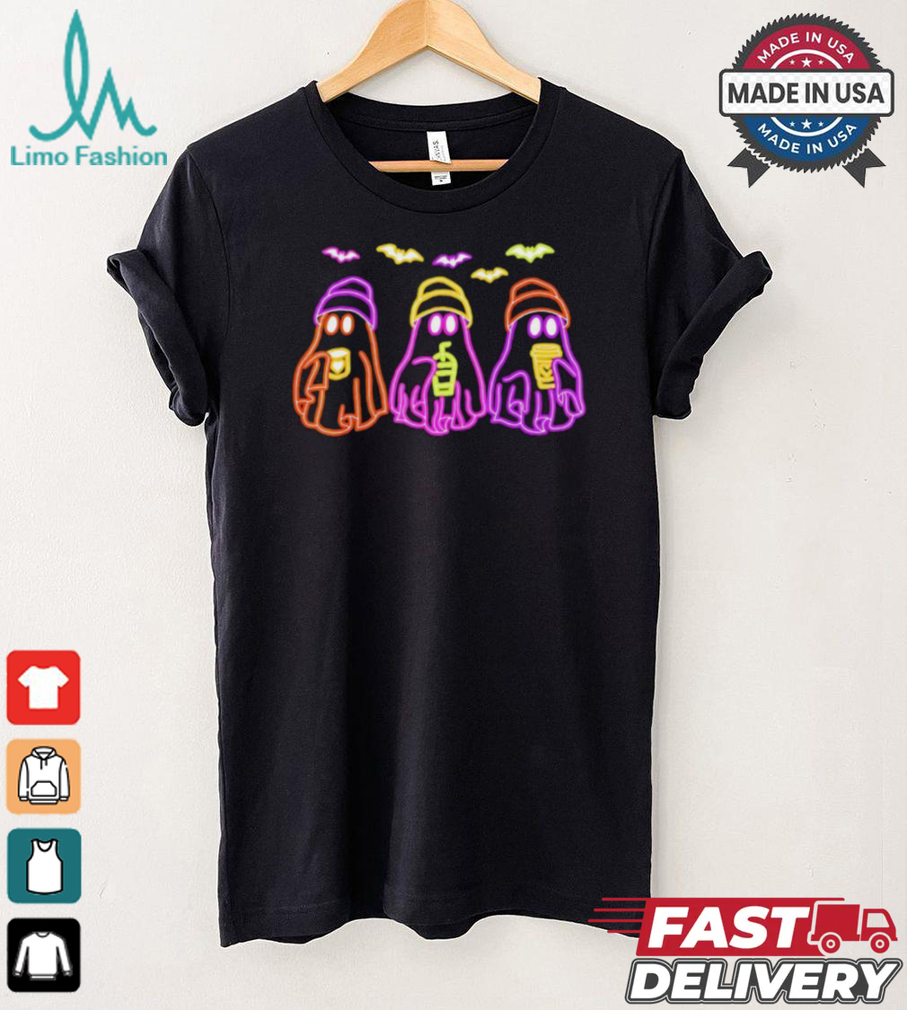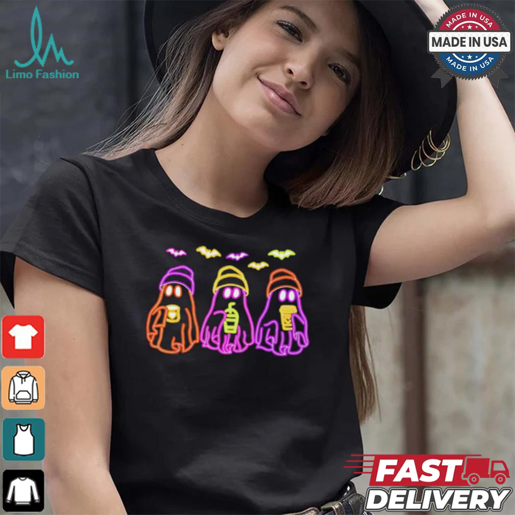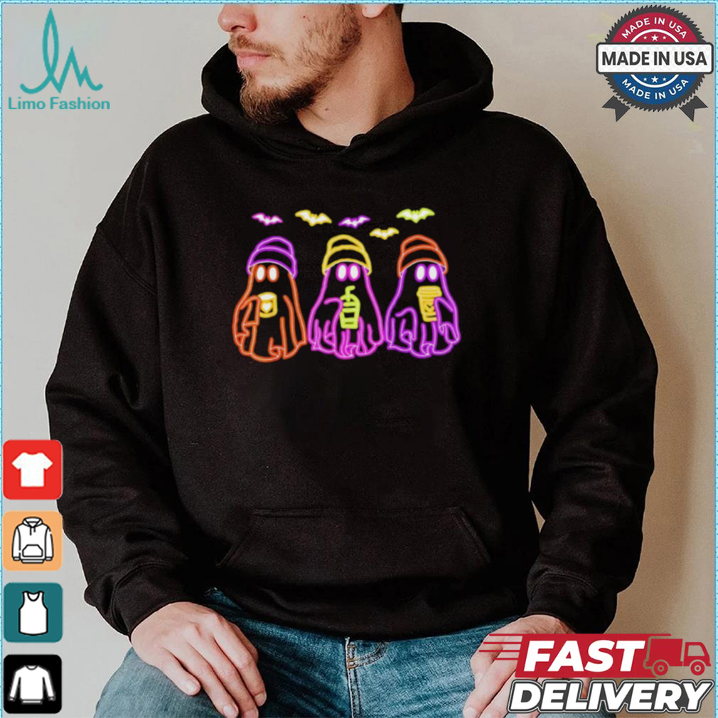 My grandfather was fond of Ghost drinking coffee Halloween neon shirt. When diabetes affected his legs and made him immobile, he continued to whistle. When glaucoma affected his eyes and he lost his eyesight, he continued to whistle. As someone in her early 20s, I found my granddad’s immense pleasure from life overwhelming and infectious. Here was a person who was losing all his senses, yet was gracious enough to utilize and maximize his happiness from the senses he still retained. Try whistling. It improves your lung capacity and will send more oxygen into your bloodstream, making you feel better instantly.Try cooking. I hear it is quite therapeutic when used to counter depression. Try duck meat (if you eat non-veg). If you have trouble sleeping, I read that tryptophan (an amino acid in duck meat) puts you to sleep instantly. Alternatives: try honey with milk before sleeping.