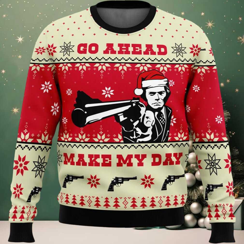Do you feel lucky, punk? Deck the halls with a touch of classic action movie attitude this holiday season with this Go Ahead Make My Day Ugly Christmas Sweater. Inspired by the iconic line from Dirty Harry, this sweater is perfect for those who like their Christmas with a side of sarcasm and a whole lot of retro cool. It’s a bold statement piece that’s sure to get some laughs and maybe even a little bit of respect at your next holiday gathering.