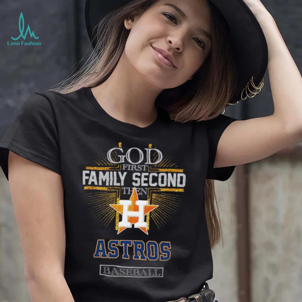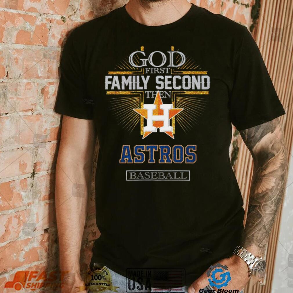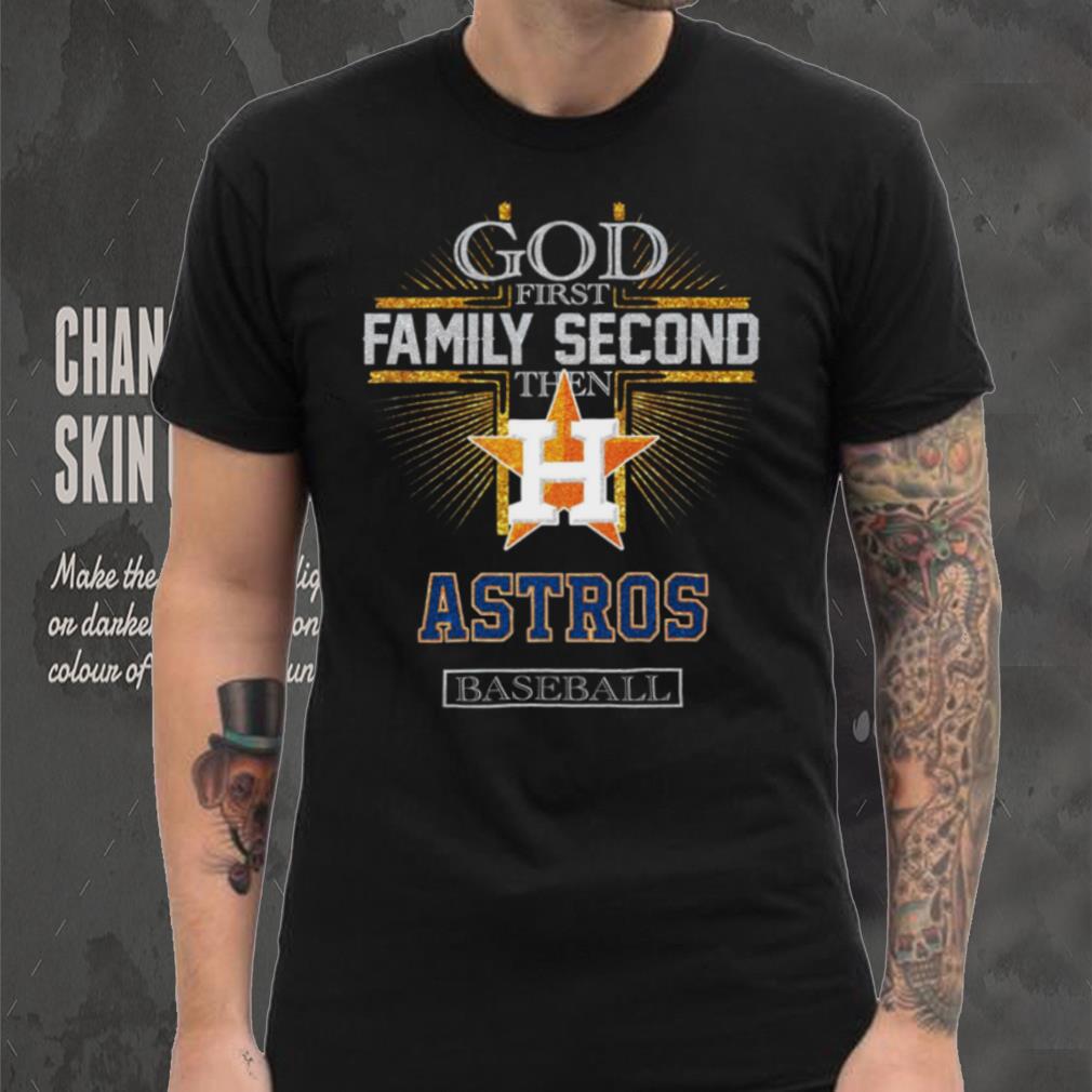 People strung cranberries and popcorn, starched little crocheted stars to hang, made paper chains and God First Family Second Then Astros Basketball Shirt had glass ornaments, usually from Germany, about two inches wide, they would get old and lose their shine. There was real metal tinsel too, that you could throw on with the argument about single strands and clumps. Each side had it’s followers. In the fifties various lights were a big deal, with bubble lights, that had bubbles in the candle portion that moved when plugged in. There were big primary colored lights strung around the tree too, nothing small or ‘tasteful’ Christmas trees were meant to be an explosion of color and light. I took Styrofoam balls and a type of ribbon that would stick to itself when wet, and wrapped the balls, and then used pins to attach sequins and pearls for a pretty design in the sixties. I also cut ‘pop-it’ beads meant for a necklace into dangling ornaments with a hook at the top to put it on the tree. Wrapped cut-up toilet paper tubes in bright wools too. Kids still remember making those.