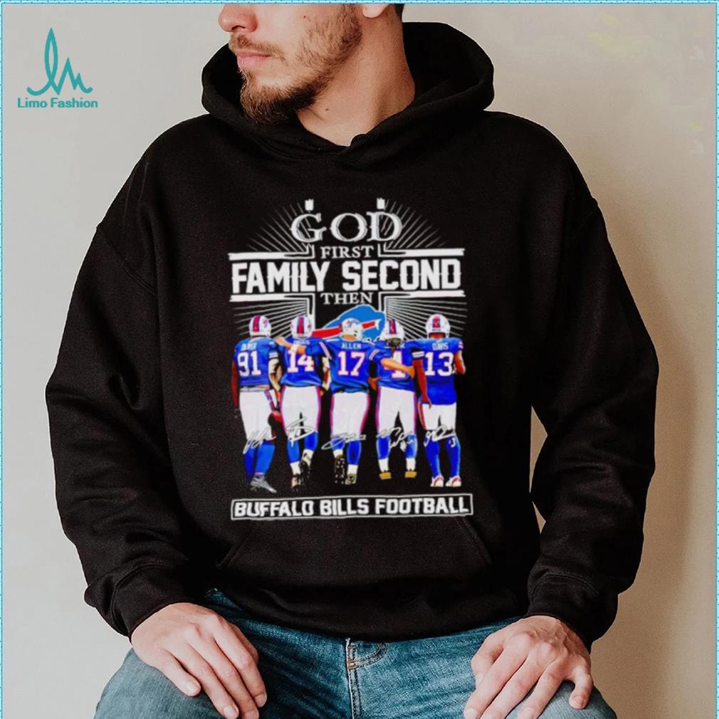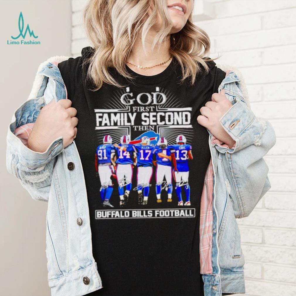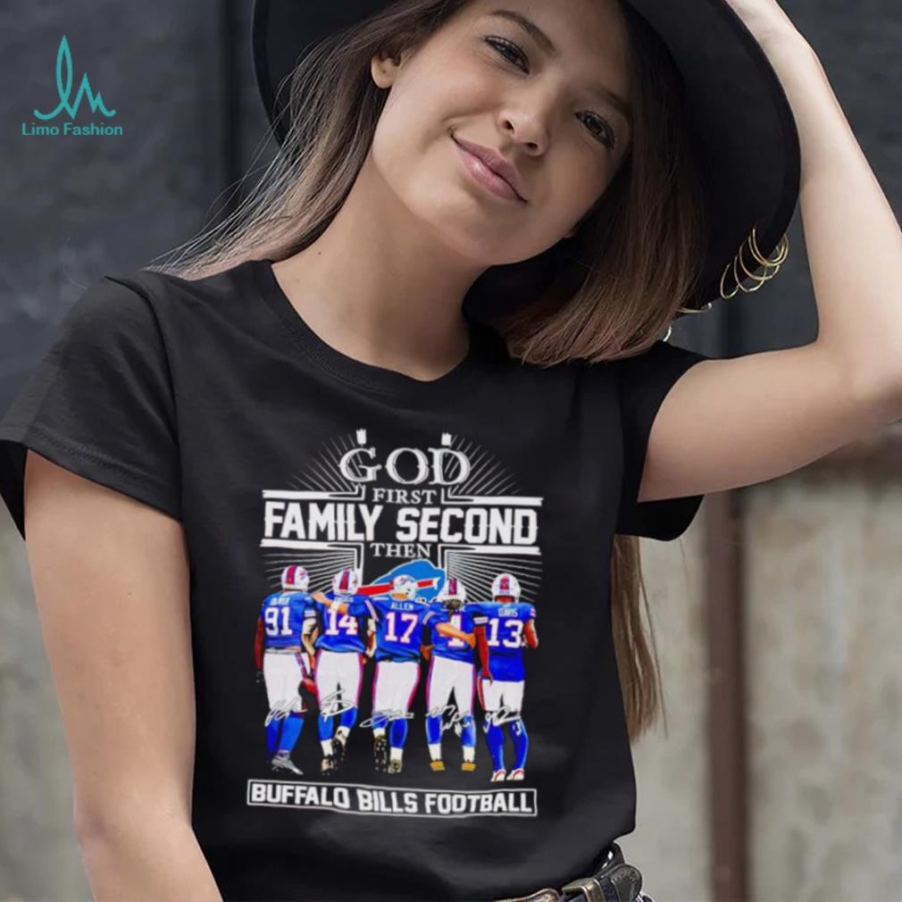 The God first family second then Buffalo Bills football signatures shirt term “Tết” is a shortened form of Tết Nguyên Đán, with Sino-Vietnamese origins meaning “Festival of the First Morning of the First Day”. Tết celebrates the arrival of spring based on the Vietnamese calendar, which usually has the date falling in January or February in the Gregorian calendar. Tet Vietnam is celebrated to welcome the Lunar New Year and summarize what they did in the old one. It is considered an important mark for changes, plans, and progress. In addition, Vietnamese people believe that what they do on the first day of the new year will affect their rest. Therefore, they pay great attention to every word they say and everything they do. Furthermore, Tet in Vietnam may be the only occasion for all family members to have happy moments together after a year of hard-working. History According to the historical documents, in the thirteenth century, Vietnamese people often celebrated the Tet holiday by painting tattoos on themselves, drinking traditional glutinous-rice liquor, using betel nuts to welcome guests, and eating Chung cakes, pickled onions. In the Ly dynasty (1009-1226), many important rituals were made on the Tet festival such as setting up a dome to pray for the rains or building communal houses to crave for a year of abundant harvests. In the period of King Le Thanh Tong (1442-1497), Tet was the most important festival and hundreds of mandarins had to gather at the royal court to celebrate this lunar new year festival with royal families.