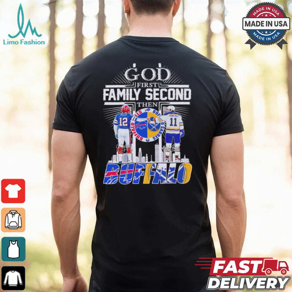 This feast, although not as impressive as Easter, is nevertheless an excellent time to prepare ourselves, not just for the God first family second then Buffalo Bills x Buffalo Sabres skyline shirt of Our Saviour into the world, the first time, but we are to prepare for His Second Coming, which will arrive as unfailingly as the first one did. Most of us will not be on earth when He comes again, but we will nevertheless experience all of this in our very own end of this world, when we die, and must stand before the judgment seat of Christ and answer for our lives. So we prepare for that dread event NOW, by, above all, going to confession weekly. If you do not already do this, now is an excellent time to start, This coming Sunday – 1 December- is the start of a new year! So begin this week to prepare for the coming of our Saviour!