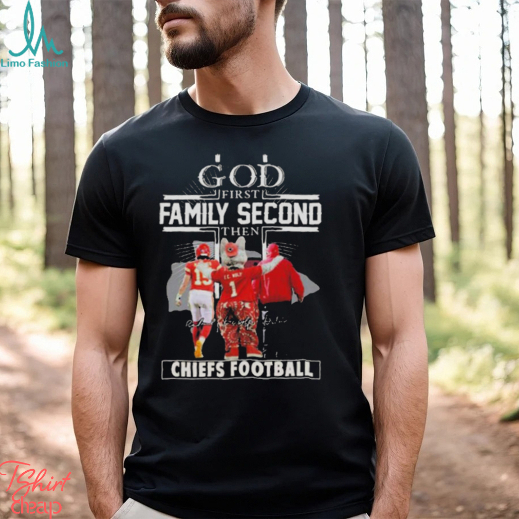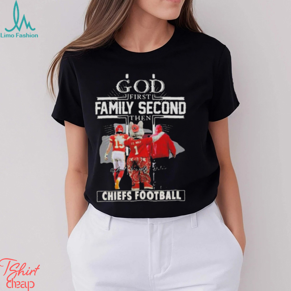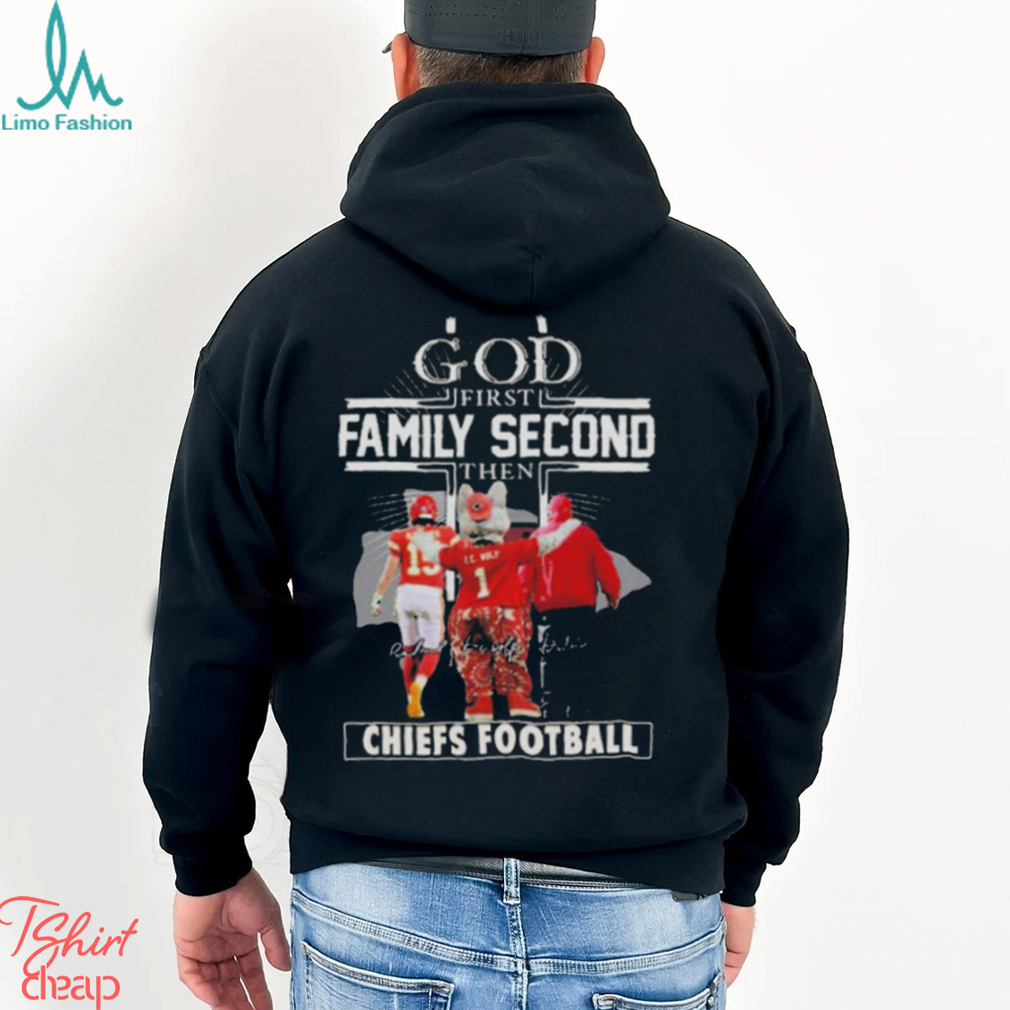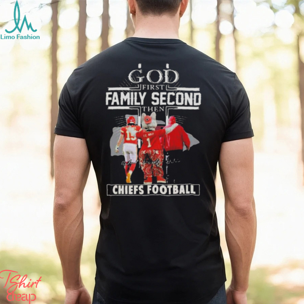 You see, Christmas Eve is really the God First Family Second Then Chiefs Football Unisex T Shirt when my mom’s sisters and brothers would all gather in South Boston with their kids (My cousins of course.) Since they too were teens like myself back in the day, they all did their own thing on Christmas morning — But the one thing they didn’t want to do was leave their gifts after opening them. So Christmas Eve became more important to us as a whole to come together, celebrate and then visit midnight mass at the local church before going home. By the time I got home, it was after 1am, so I guess it was really Christmas morning if you want to get technical about it. The gifts were promptly opened and I was in bed no later than 3am to sleep most of the morning in peace. Now with two kids of my own, I will be getting up Christmas morning to greet the day and watch their faces. Mainly because Santa Claus is still important to them and he only visits on Christmas Eve when you’re asleep as all know.