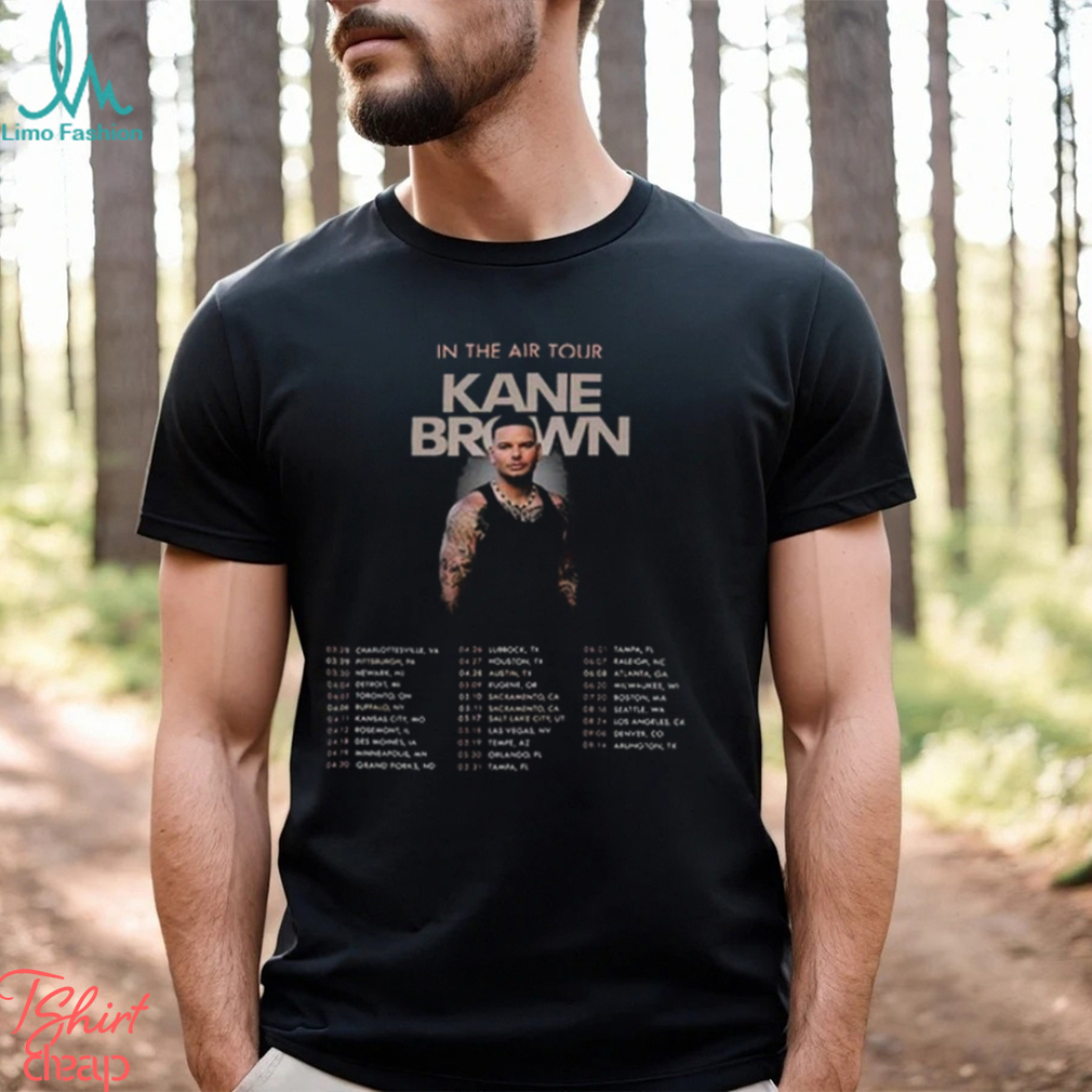 Usually a couple years into the Graphic Kane Brown In The Air 2024 Tour Black Unisex Shirts, when the budgets have run into the millions, the team starts to disband. The original group moves on to new projects. Team replacements need to re-learn what the lost members knew. They make some progress in the replacement system. New unrelated projects begin to pull data from the replacement instead of the legacy. Then, suddenly, the plug is pulled. The team is asked for an estimate of what it will take to complete the project. The answer has so many digits that management says, “No way. We simply can’t afford that.” That means that the original legacy is still in place. New systems have been written around and on top of it, burying its fossilized remains ever deeper, making the complexity ever more substantial. Because new systems were built to depend upon the replacement, we can’t abandon this partially completed system. Now we have to maintain the original legacy system and the new “legacy” that we’ve abandoned part way in. To go back to the original analogy, we now have a car with one and a half, or two frames. One of the wheels may now be mounted on the new frame, but the rest of the wheels and the doors, and the damn tail pipe remain stubbornly welded to the old frame. Future attempts will require that this entire unwieldy mess be replaced.