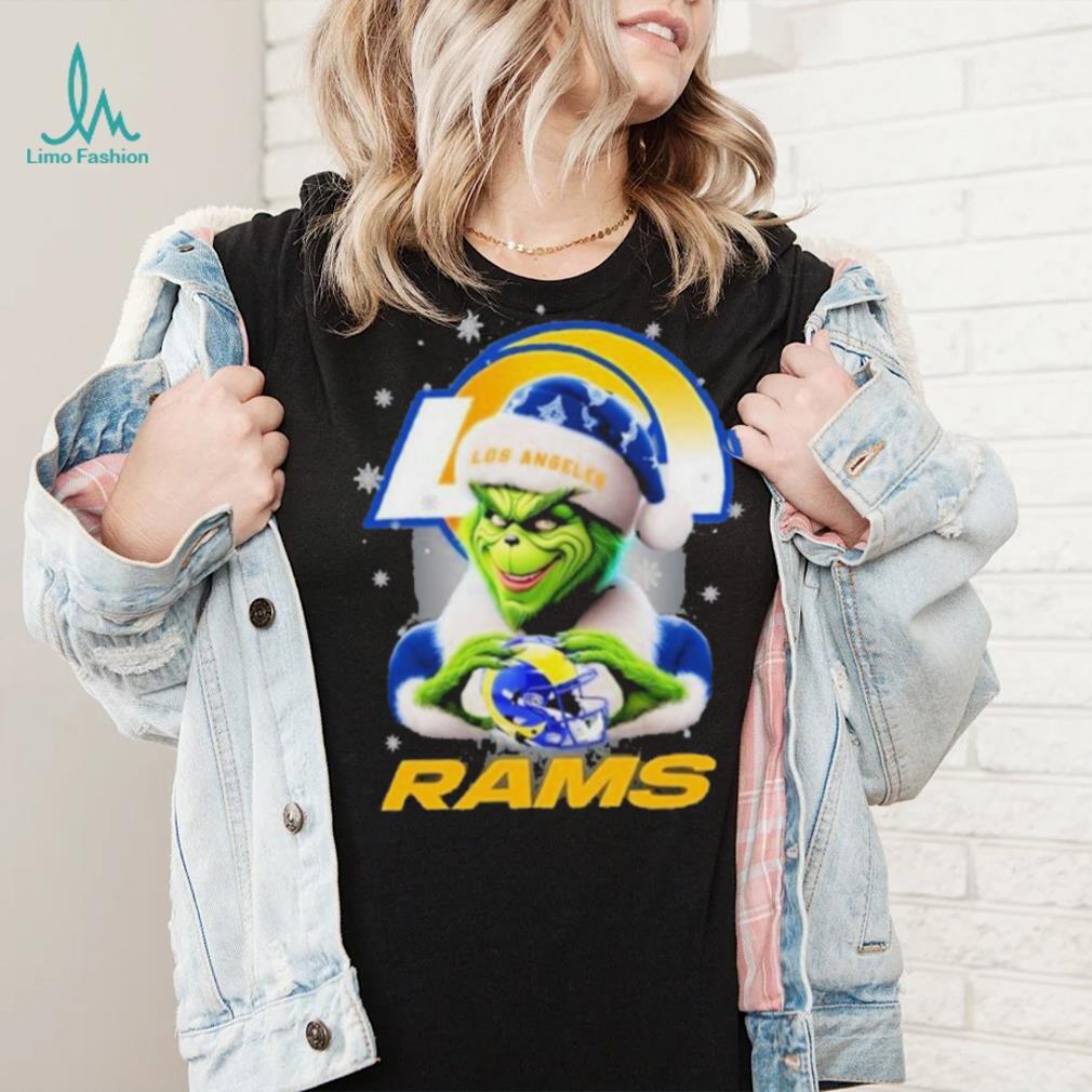 Off we drove, with the Christmas tree comfortably between the two of us! I drove Robin back home and we maneuvered the tree out of the Grinch Hat Santa Los Angeles Rams Helmet Logo Merry Christmas Shirt as pine needles dropped profusely all over the VW bug. I setup the tree in her home after moving a few pieces of furniture and she went off to get a box of decorations. At that point in time, I could sense she wanted me to stay to decorate the tree, but I knew I could not because my girl-friend was waiting. I gave her a big hearty hug, and told her Merry Christmas as I left. In my life time and with all due sincerity…that was my best ever holiday… “So this is Christmas.” moment!