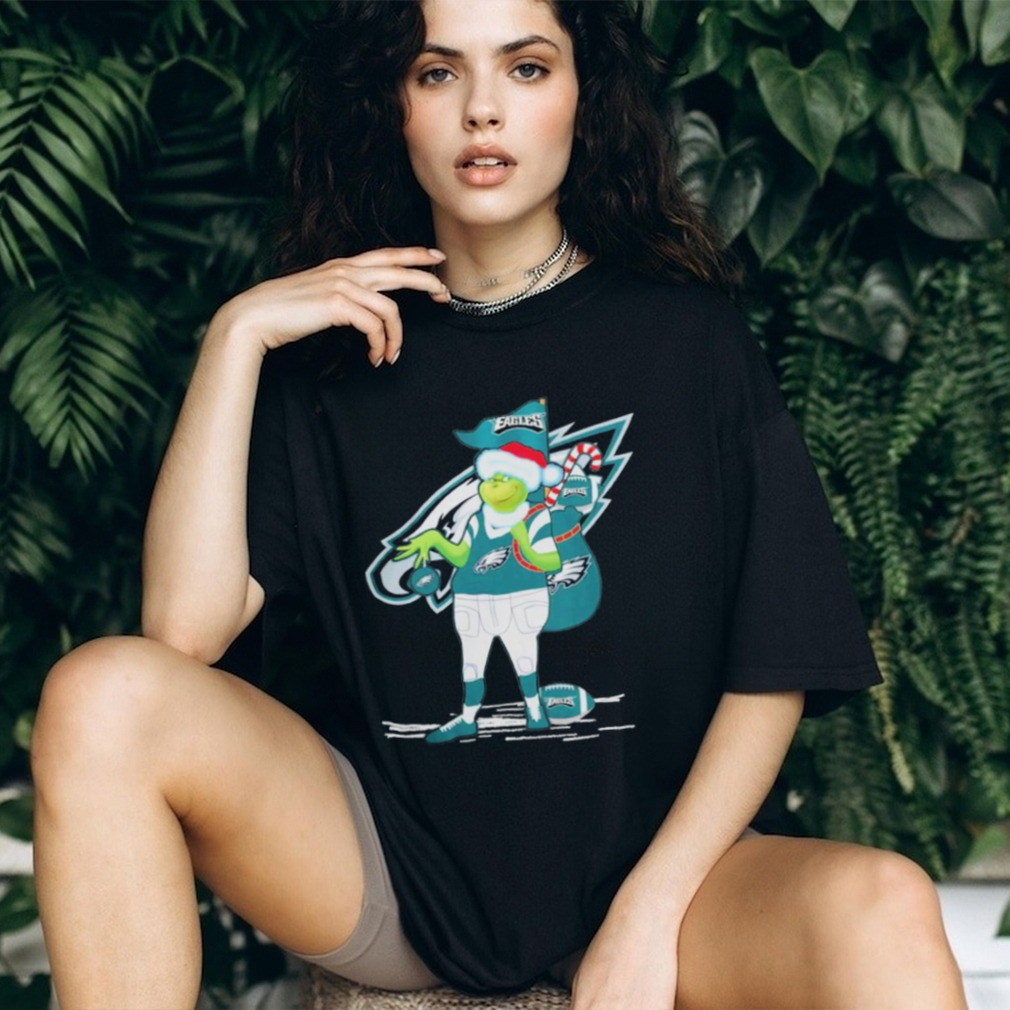 Every year she wrote a letter to Santa Claus asking for a Grinch Hat Santa Philadelphia Football Gift Christmas 2023 Shirt of things she knew would come to her only by a miracle. Though just 7 years old she knew She was lucky enough to end up in the orphanage though she has nothing a kid craves for. But every year she is disappointed by just a piece of cake and a little used frock as Xmas gift. She stopped believing in Santa and lost Xmas spirit ever. When she was 12 years old she realized the main thing she is missing and wished just one thing this Xmas.. Love. The next morning the patron of the orphanage comes to her and says ‘you are adopted by a childless family. Please pack your things and be ready to meet them. ‘ Her voice dominated the Christmas Carols ever after that.