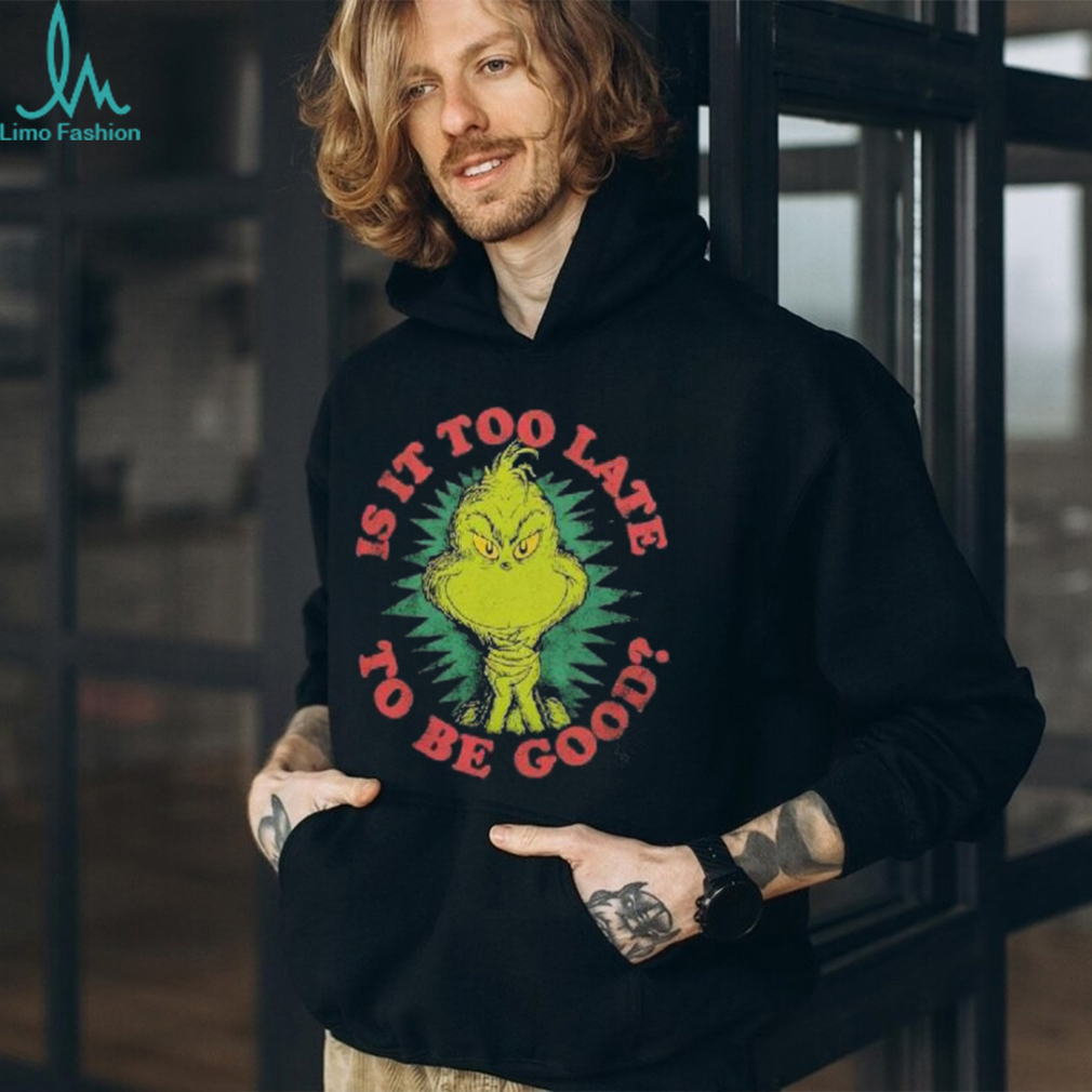 Grinch Is It Too Late To Be Good Dr. Seuss T Shirt. Categories of this T-shirt is teejeep, Grinch Is It Too Late To Be Good Dr. Seuss T Shirt from Dadyshirt ✓ Unique designs ✓ Large assortment ✓ Comfortable ✓ High-quality ✓ Easy to care for ✓ Available in a range of colours and styles for men, women ✓ Shop now ✓