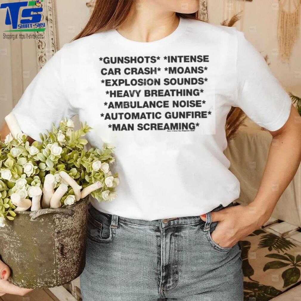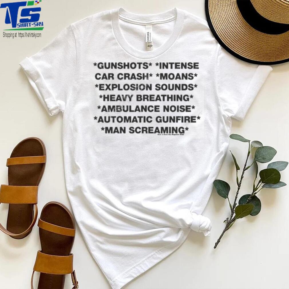 ()Gunshots intense car crash moans explosion sounds heavy breathing ambulance noise automatic gunfire man screaming shirt