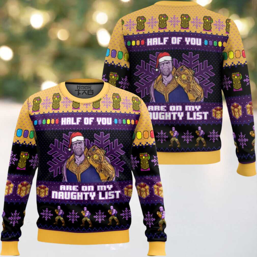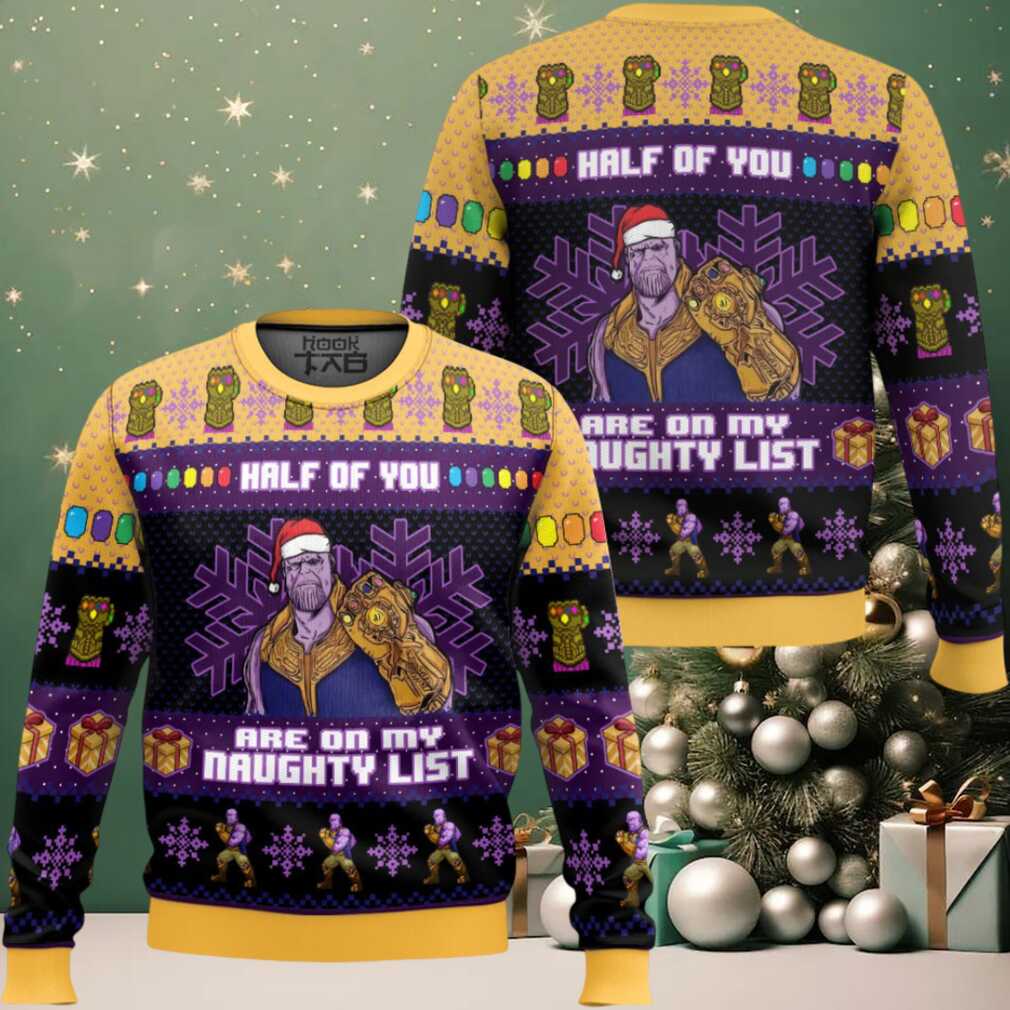 With each **Half Of You Are On The Naughty List Thanos Ugly Christmas Sweater**, you are contributing to creating a green tree. To keep your mighty sweater looking its best, wash it inside out with cold water and tumble dry on low. This care routine helps preserve the vibrant design and ensures your cosmic Christmas style remains legendary.