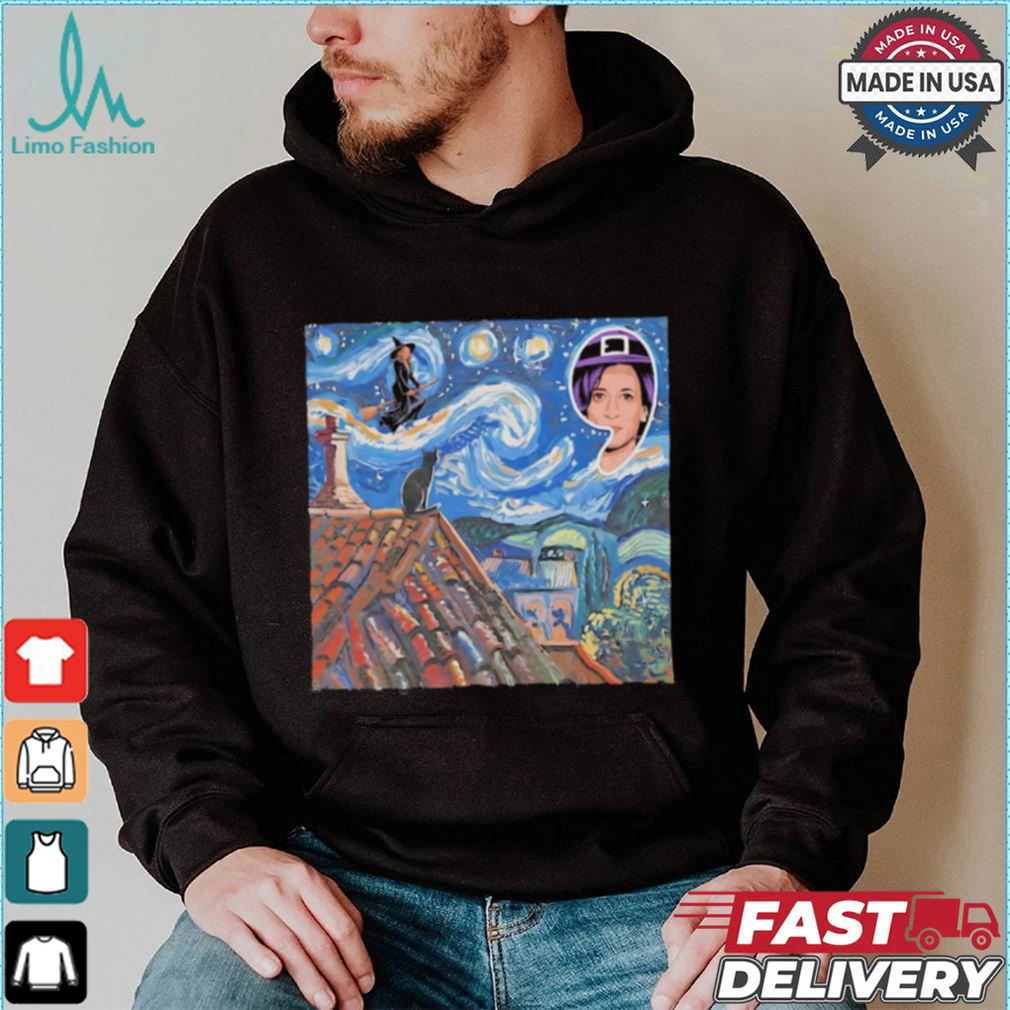 Halloween Starry Night Kamala Harris Witch Black Cat Comma La Van Gogh art shirt