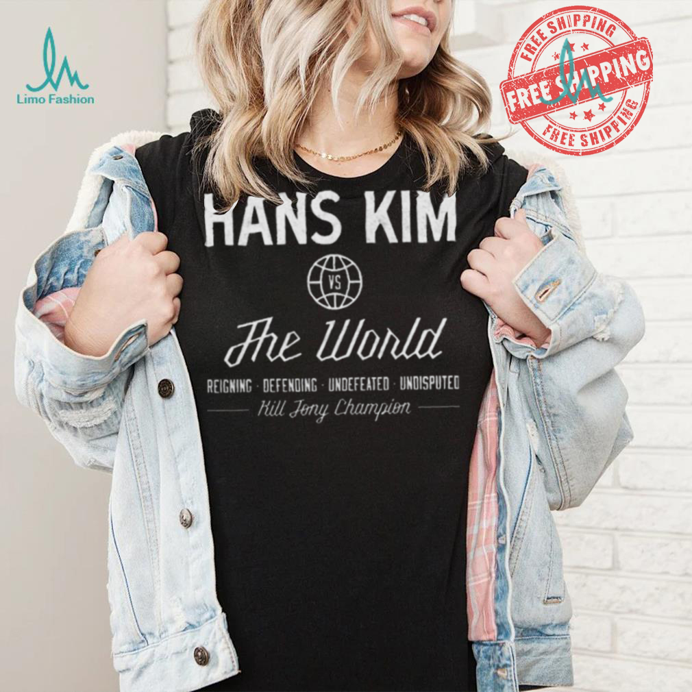 My funny story is when Santa put himself on the naughty list. I travelled the Hans Kim vs The World Hill Johnny Champion shirt home from work a few years ago, and I enjoyed all the Christmas lights and decorations every night. One house had a huge blow up Santa on top of the garage, with his arm raised, waving at you when the wind blew. One day I left work early, and it was still daylight. As I turned the corner on this windy day, I saw Santa was a bit deflated. He was slightly bent over and his arm had fallen down so that his hand was between his legs, and the wind was blowing a bit, and he was gently bobbing up and down, up and down, and he seemed to be enjoying himself entirely too much! I was crying with laughter, and I can never look at Santa again without flashbacks.