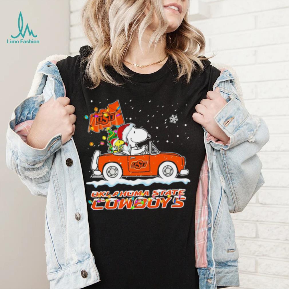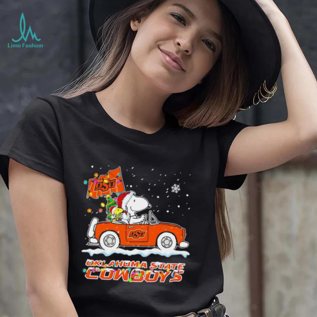 ()Happy Merry Christmas Snoopy drive a car Oklahoma State Cowboys logo flag gift shirt