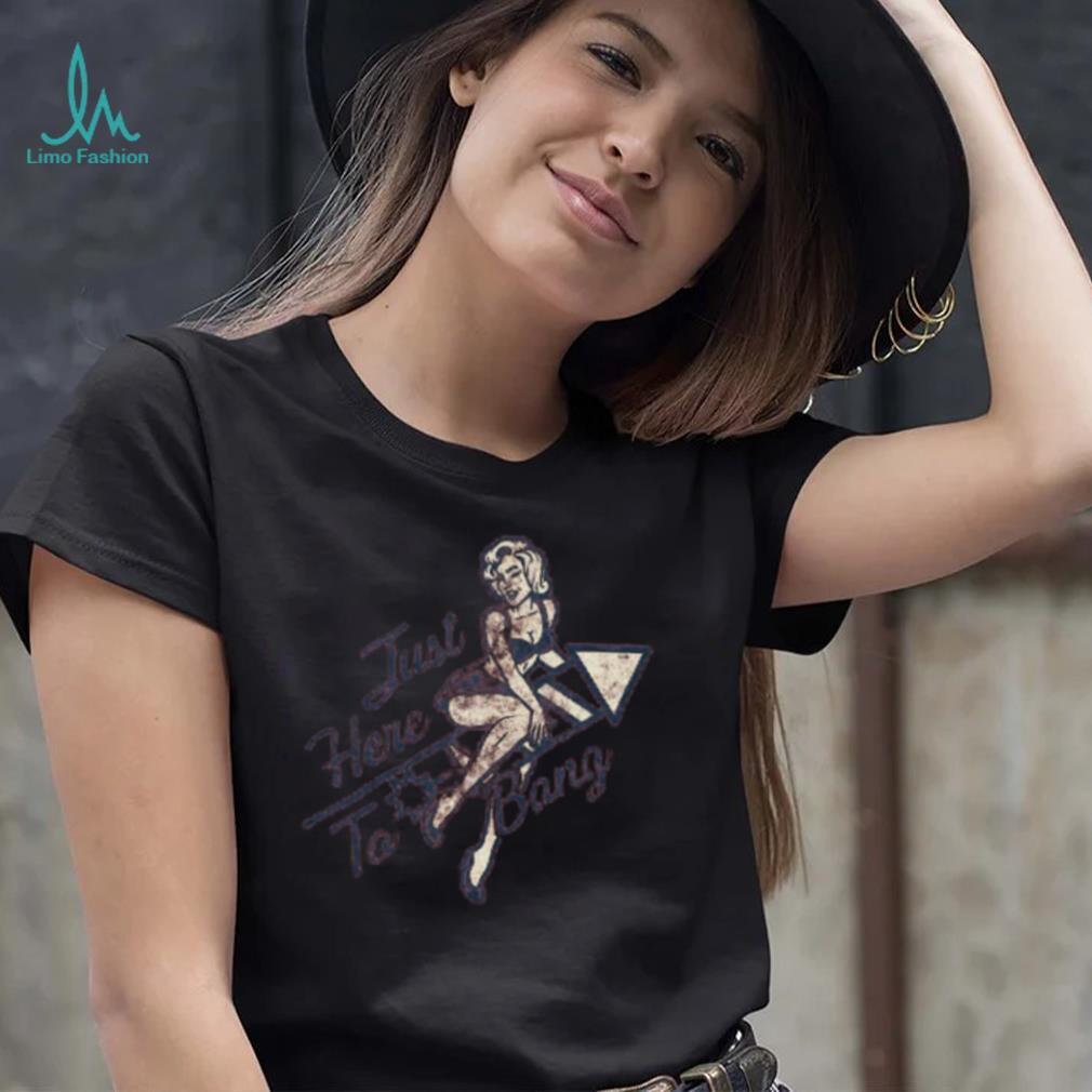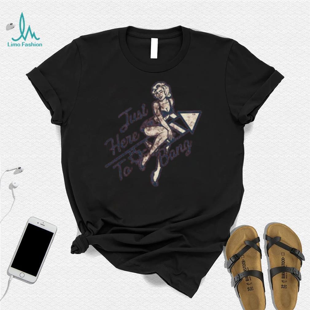 I picked up Robin and it was a very cold night, snow was on the HERE TO BANG MEN’S TSHIRT , the streets were empty of cars and people… as we set-out to find the Christmas tree. We spotted a lot, I did an illegal u-turn in my VW bug and drove up to the empty Christmas tree parking lot. The owner of the Christmas tree lot had abandoned the place and the fence gates were wide open. So we parked the car, and spent the next 30 minutes sorting through trees. Robin, was in the moment and we must have looked over at least thirty trees left behind for our pickings. I was coaching her in consideration how big of a Christmas tree we could actually fit into a VW Bug. We finally settled on a smaller Christmas tree that was propped up on a wooden stand and looked a little weak in the branch department, but not quite Charlie Brown style. I picked up the tree and moved it over to the VW bug, we had to drop the back seats, and aligned the tree between the two front seats…hey it smelled great in the car.