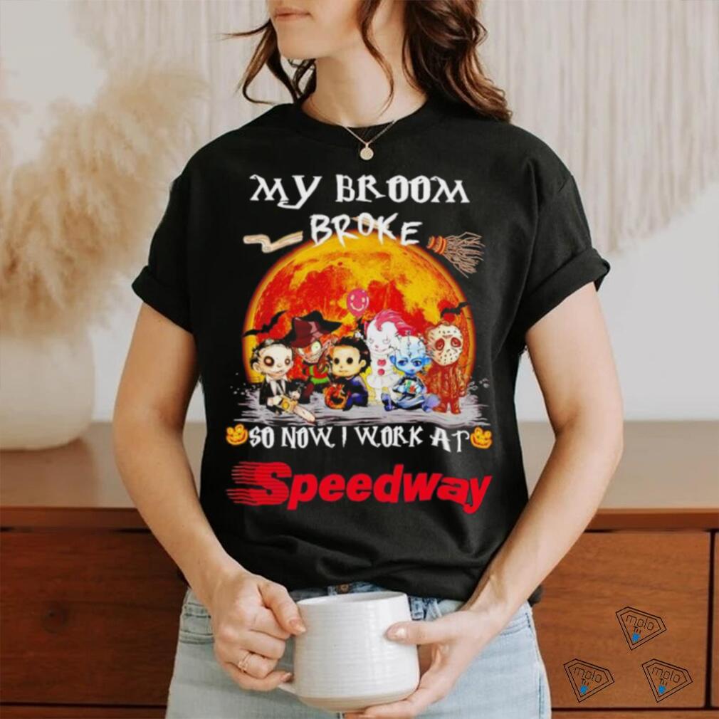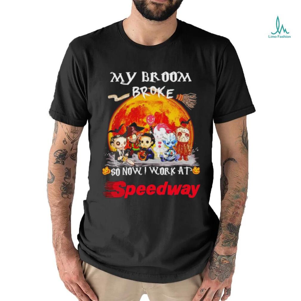 Horror characters my broom broke so now I work at Speedway shirt. Categories of this T-shirt is teejeep, Horror characters my broom broke so now I work at Speedway shirt from Dadyshirt ✓ Unique designs ✓ Large assortment ✓ Comfortable ✓ High-quality ✓ Easy to care for ✓ Available in a range of colours and styles for men, women ✓ Shop now ✓