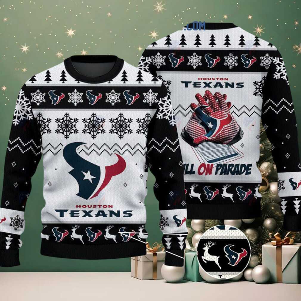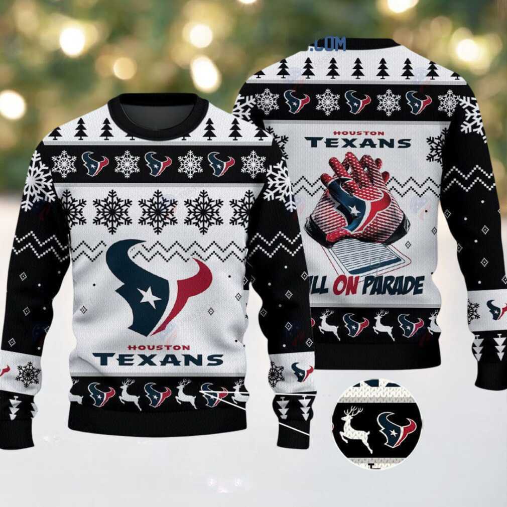 This Houston Texans Bulls On Parade Christmas Ugly Sweater is a masterpiece of festive fandom. The design cleverly integrates the iconic Houston Texans bull logo and team colors with playful Christmas elements. Picture the powerful bull, adorned with festive antlers or a Santa hat, stomping through a snowy landscape filled with snowflakes, footballs, and perhaps even miniature oil derricks wrapped in tinsel. This unique blend of Texans pride and holiday humor creates a bold, unforgettable look that’s perfect for game days and holiday parties alike.