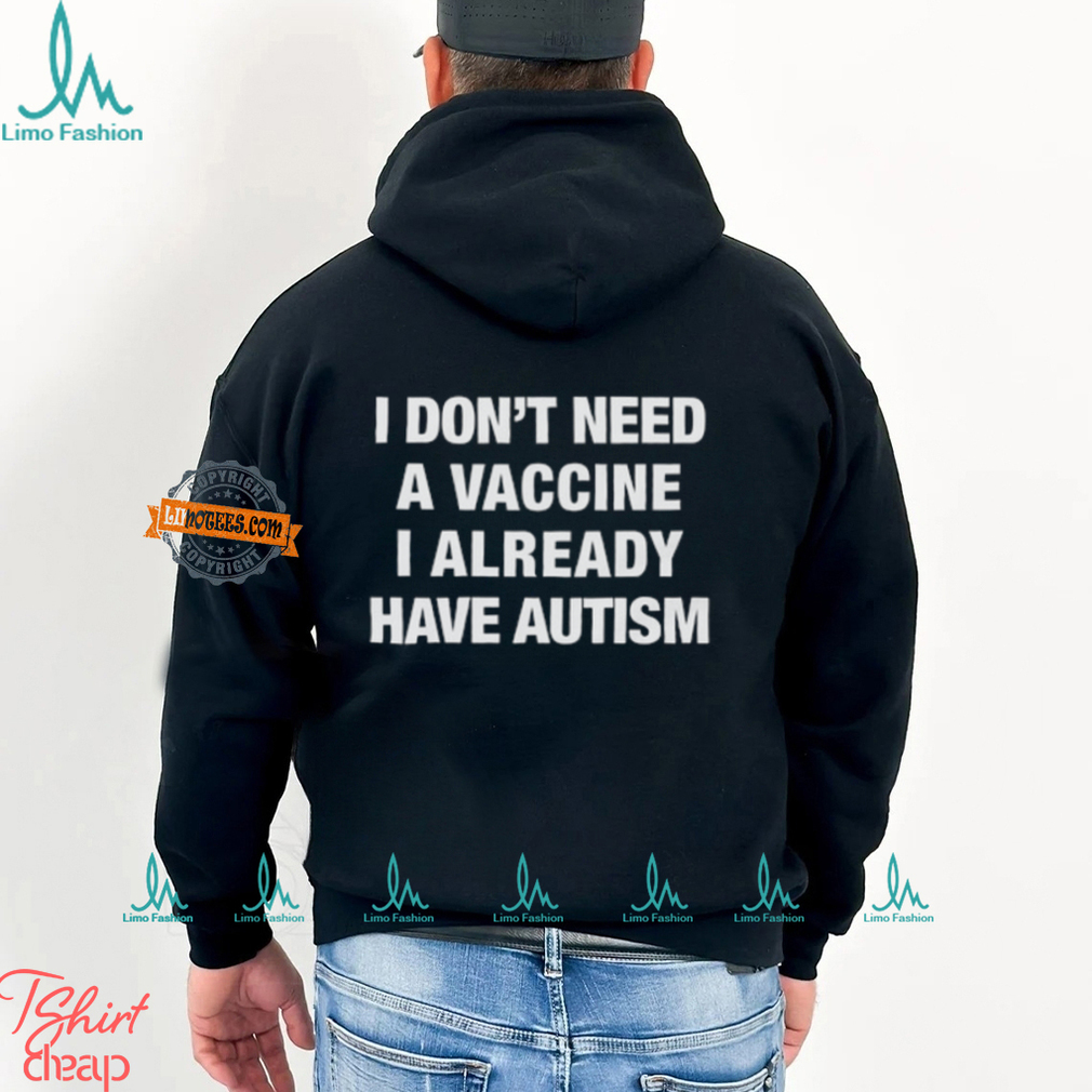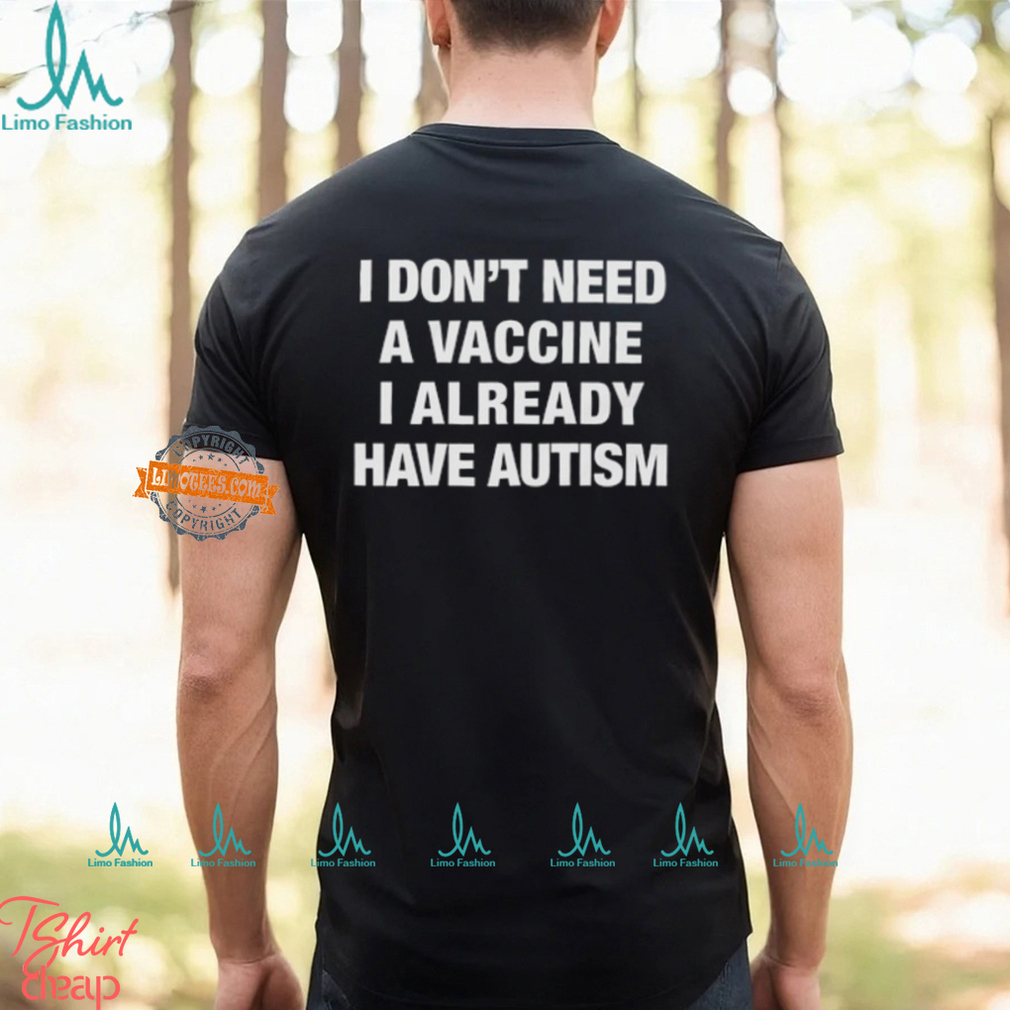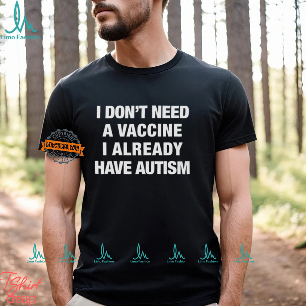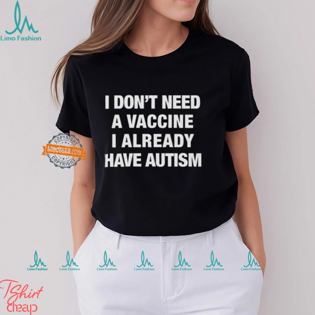 ()I Don’t Need A Vaccine I Already Have Autism Shirt. Categories of this T-shirt is limotees, I Don’t Need A Vaccine I Already Have Autism Shirt from Dadyshirt ✓ Unique designs ✓ Large assortment ✓ Comfortable ✓ High-quality ✓ Easy to care for ✓ Available in a range of colours and styles for men, women ✓ Shop now ✓