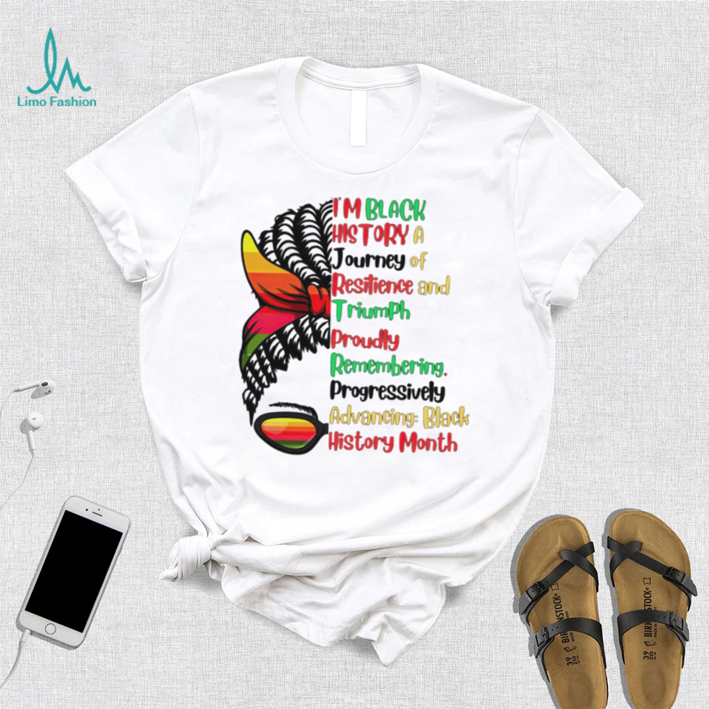 I’m black history a journey of resilience and triumph proudly remembering messy bun girl shirt