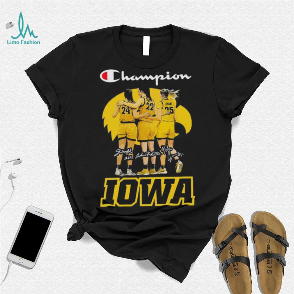 (Iowa Hawkeyes Gabbie Marshall, Caitlin Clark Monika Czinano Champion signatures shirt, ladie tee)