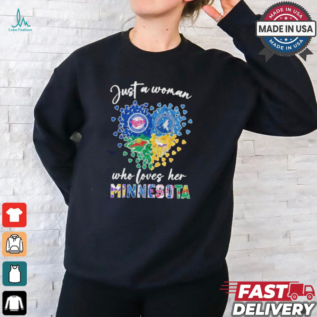 Just A Woman Who Loves Her Minnessota Sport Teams Logo Heart Shirt