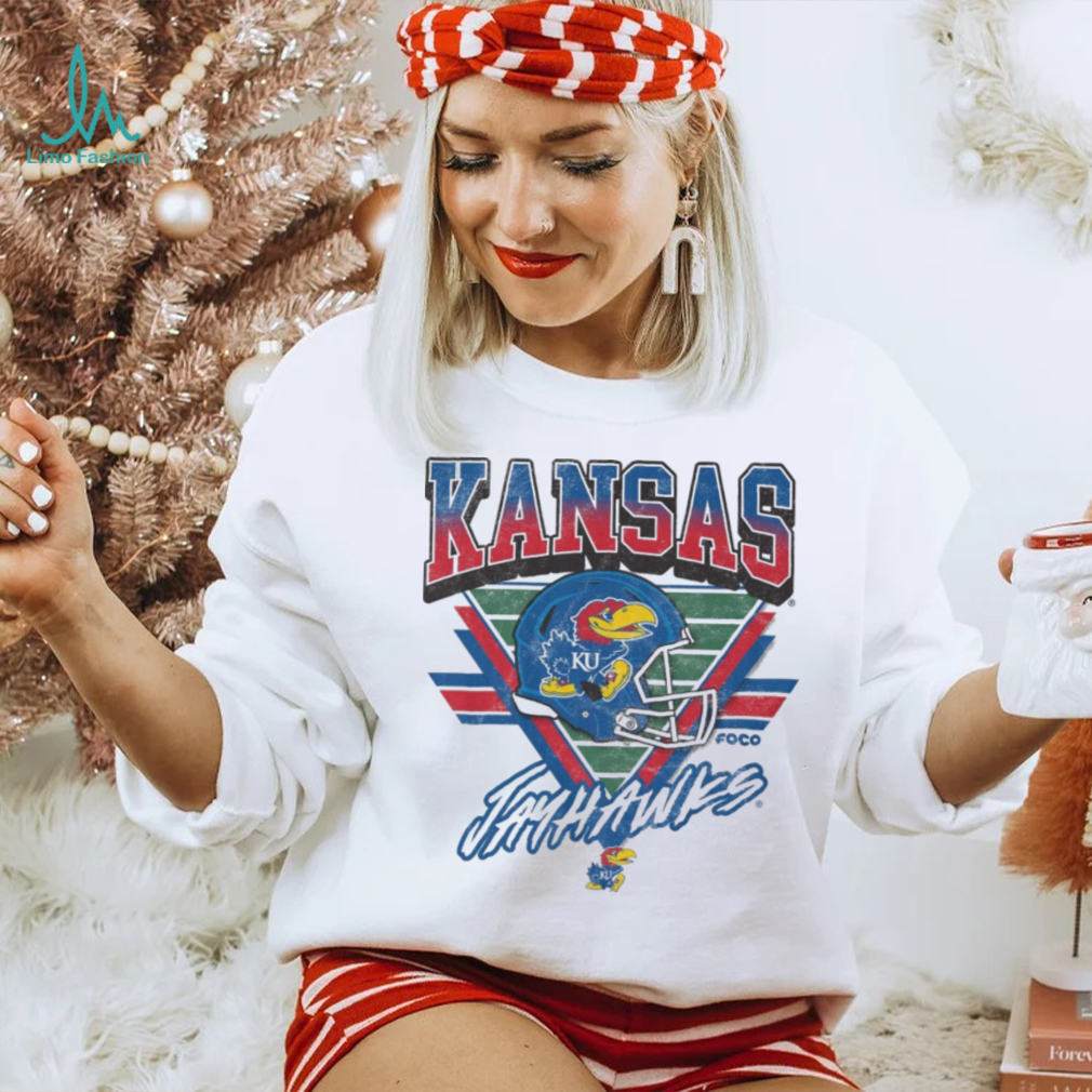 Around 11 AM, the Kansas Jayhawks Triangle Vintage T Shirt arrived. Several large, police officers approached us. They told us that they were going to shut down the operation as it was causing a huge traffic jam. I got a brainstorm, I asked the officer that appeared to be in charge if I could have a word with him (Note, I was in my hippie mode at this time). He agreed. I said, “These trees are free to anyone.” He said, “So what” I said “there are free to anyone, including the police department. You could pick up as many of the trees as you want and take them down to Watts (a very poor part of town) and give them away. Think of the PR you could get out of that.” The lights went on in his head and he turn around and talked to the other officers. I do not know what he said, but in a very short time, there were a lot more officers, but they were now directing traffic. Soon a large truck from the police department pulled up and they starting filling the truck with tress. They were already sending in an advance unit to prepare for the Christmas tree give away.