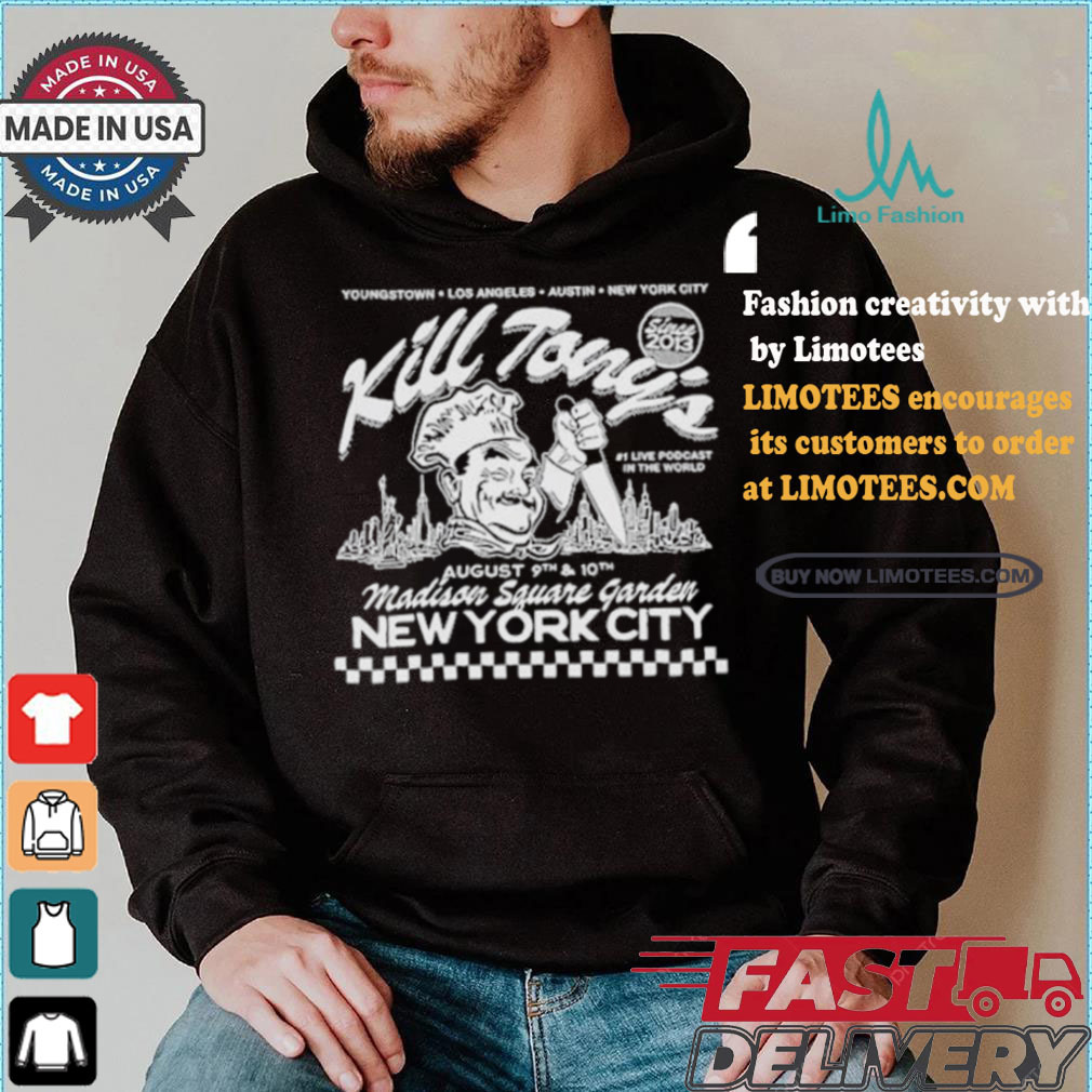 My grandfather was fond of Kill Tony Pizza Box August 9 10 Madison Square Garden Nyc T shirt. When diabetes affected his legs and made him immobile, he continued to whistle. When glaucoma affected his eyes and he lost his eyesight, he continued to whistle. As someone in her early 20s, I found my granddad’s immense pleasure from life overwhelming and infectious. Here was a person who was losing all his senses, yet was gracious enough to utilize and maximize his happiness from the senses he still retained. Try whistling. It improves your lung capacity and will send more oxygen into your bloodstream, making you feel better instantly.Try cooking. I hear it is quite therapeutic when used to counter depression. Try duck meat (if you eat non-veg). If you have trouble sleeping, I read that tryptophan (an amino acid in duck meat) puts you to sleep instantly. Alternatives: try honey with milk before sleeping.