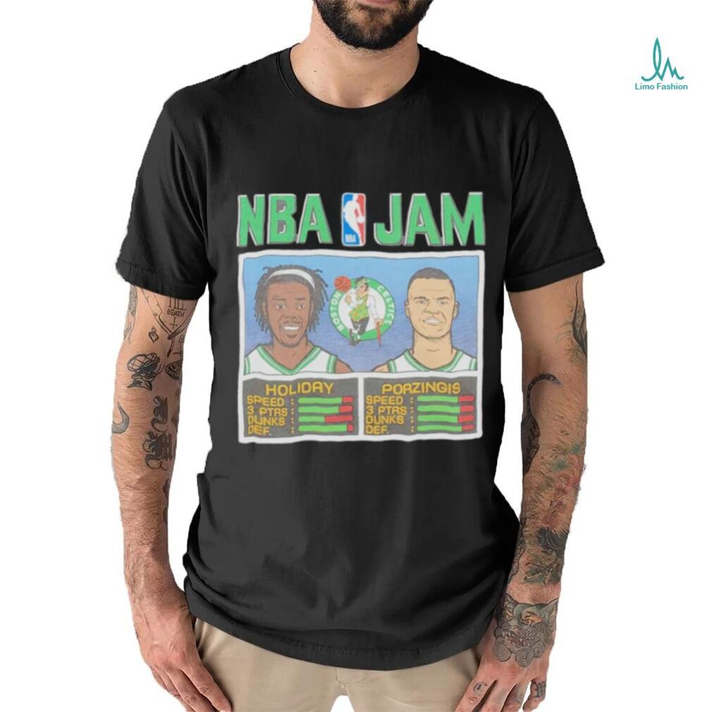 Kristaps Porzingis and Jrue Holiday NBA Jam Boston Celtics basketball shirt. Categories of this T-shirt is teejeep, Kristaps Porzingis and Jrue Holiday NBA Jam Boston Celtics basketball shirt from Dadyshirt ✓ Unique designs ✓ Large assortment ✓ Comfortable ✓ High-quality ✓ Easy to care for ✓ Available in a range of colours and styles for men, women ✓ Shop now ✓