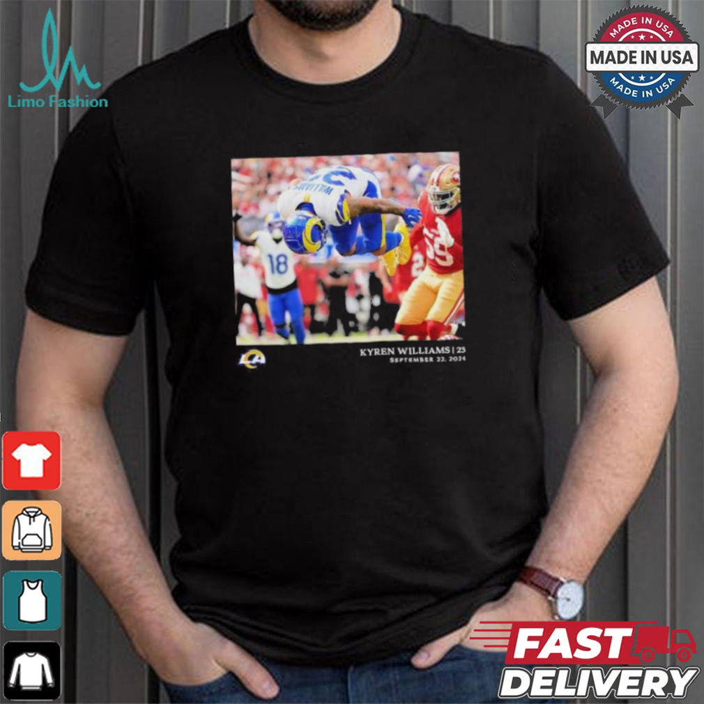 The issue of royalties varies depending on the Kyren Williams Los Angeles Rams NFL Flash Features Week 3 T Shirt in place at the time. I can’t speak for “A Christmas Story” and whether all actors were on a royalty system, were all members of SAG, all had the same provisions in their contracts and so on. It is quite common in some countries such as the USA for actors to get ‘points’ for a percentage of the profits in all subsequent uses (broadcast, cable, internet, etc.) This system is subject to the production company’s accountancy practices though so actors do have to trust that they get their fair share unless they have a degree in finance and access to the labyrinthine accounts. I have acting colleagues who appeared in Beverly Hillbillies (the original 60s TV series) and in Star Wars. The money from the 60s show trickles in and the amounts are trivial however the amounts from the Star Wars reboot are more significant.