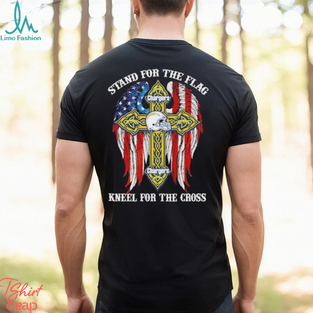 My stepfamily – my brother, brother’s wife, and her kids (which he adopted) – have many wonderful qualities, but organisation is not one of Los Angeles Chargers Stand For The Flag Kneel For The Cross 2024 T shirt. Even when I was 15 my brother (18 years older than me) would call me, panicking, on Christmas Eve, wanting me to come shopping and help pick out stuff for his girlfriend. Now that he’s married and in his fifties, he no longer calls me for shopping help, but I expect he still leaves a lot of it till Christmas Eve. This year I’ve been texting him and my niece since September, asking what to get for my nephew and his partner (who I don’t know that well, and I’ve never met his partner), my niece’s partner (ditto), and five kids (I was never an average kid and have no idea what to buy children, as shown by a couple years ago, when I bought the 3-year-old a box set of the Chronicles of Narnia, and then was startled when I was gently told that 3-year-olds can’t read. I taught myself to read with Enid Blyton at 3, and my dad gave me Narnia by the end of that year, but apparently this is not the norm).