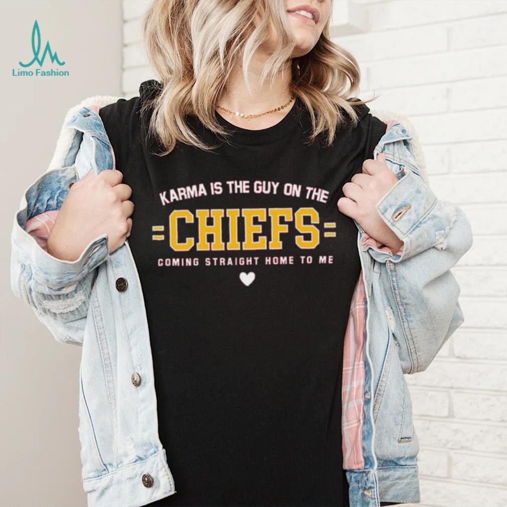 The Lyrics Karma Is The Guy On The Chiefs Coming Straight Home To Me Shirt to when Beethoven first realizes his deafness and he explains that Theresa would not love him were she to know. He is then shown Theresa’s reaction to his unexplained absence and he realizes that his deafness is the cause of all his problems. Fate explains that if she cures his deafness his music will suffer, as the Muses would not be heard as easily through the everyday sound. He thus withdraws his request. Beethoven is then shown that Theresa would have loved him forever and he becomes very sorrowful. But Fate then offers visions of the countless musicians of the future who would be influenced by Beethoven’s works. As one last, ultimate vision he is allowed to improvise with the musicians of the past and future who were inspired by him. Realizing that removing the hardships from his life would destroy his music, Beethoven informs Fate that he will not change any part of his life.