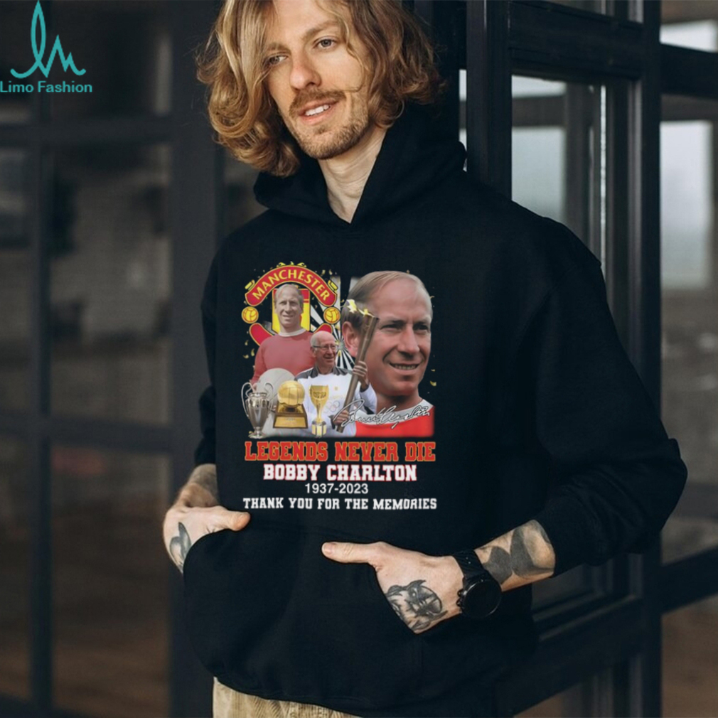 Manchester United Legends Never Die Bobby Charlton 1937 2023 Thank You For The Memories Signature T Shirt, Hoodie, Sweater, Vneck, Unisex and T-shirt