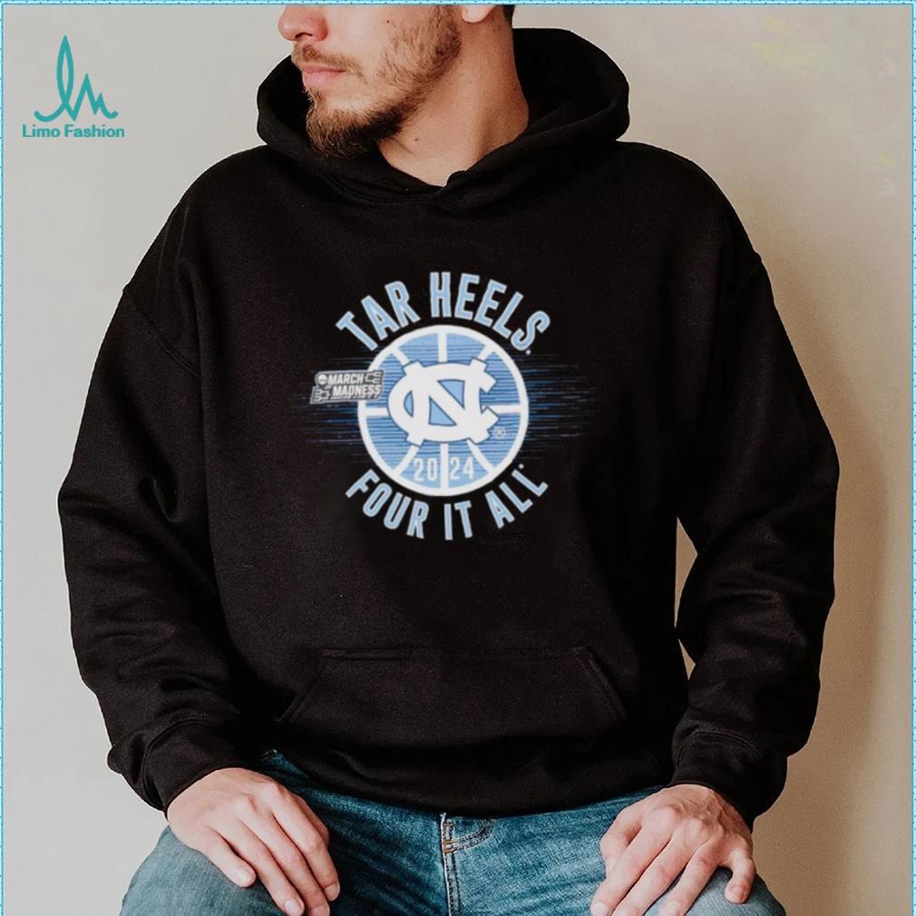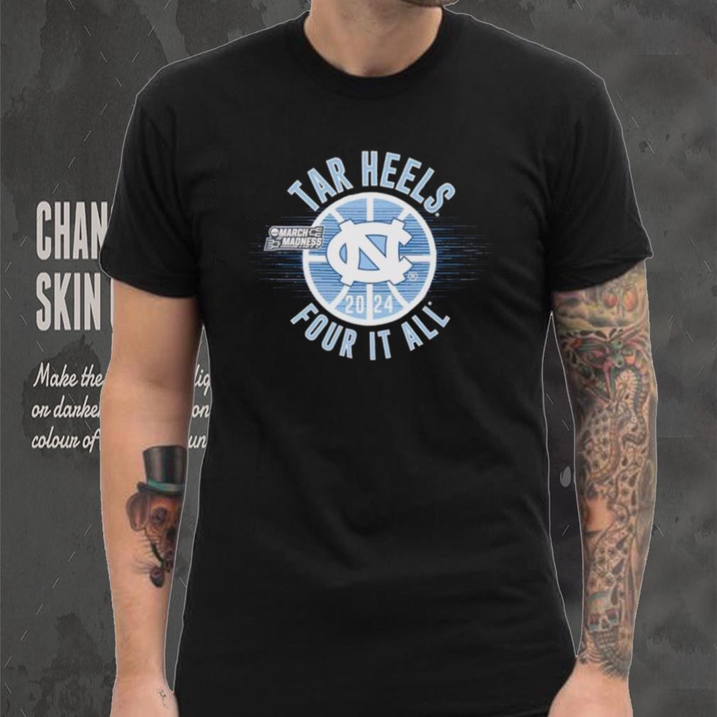 And then she stood up, looked behind the March Madness Tar Heels 2024 four it all shirt and noticed that what she had seen before was only displayed on a screen, and behind the screen, there was no real pond with fishes or a meadow with insects..nothing. From then on she never responded to that game again, from then on she would only eye it without interest.