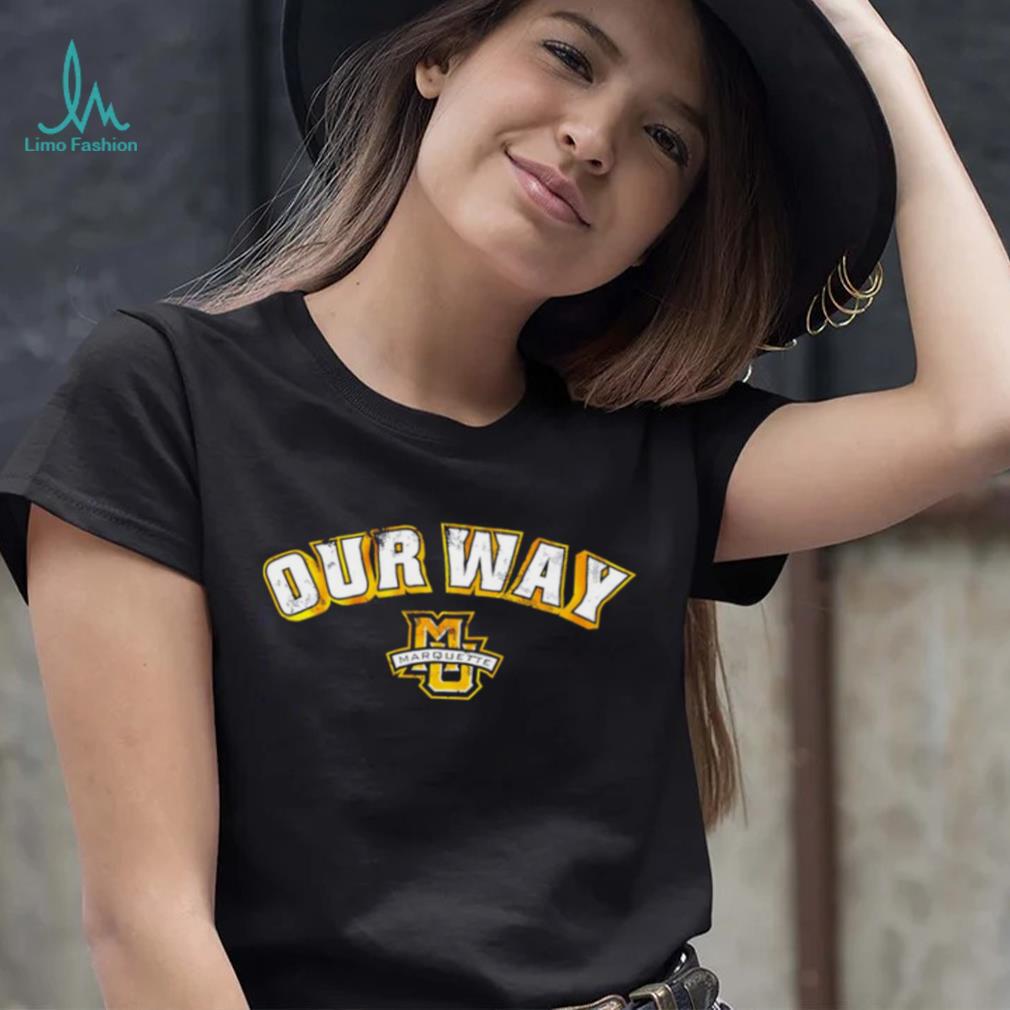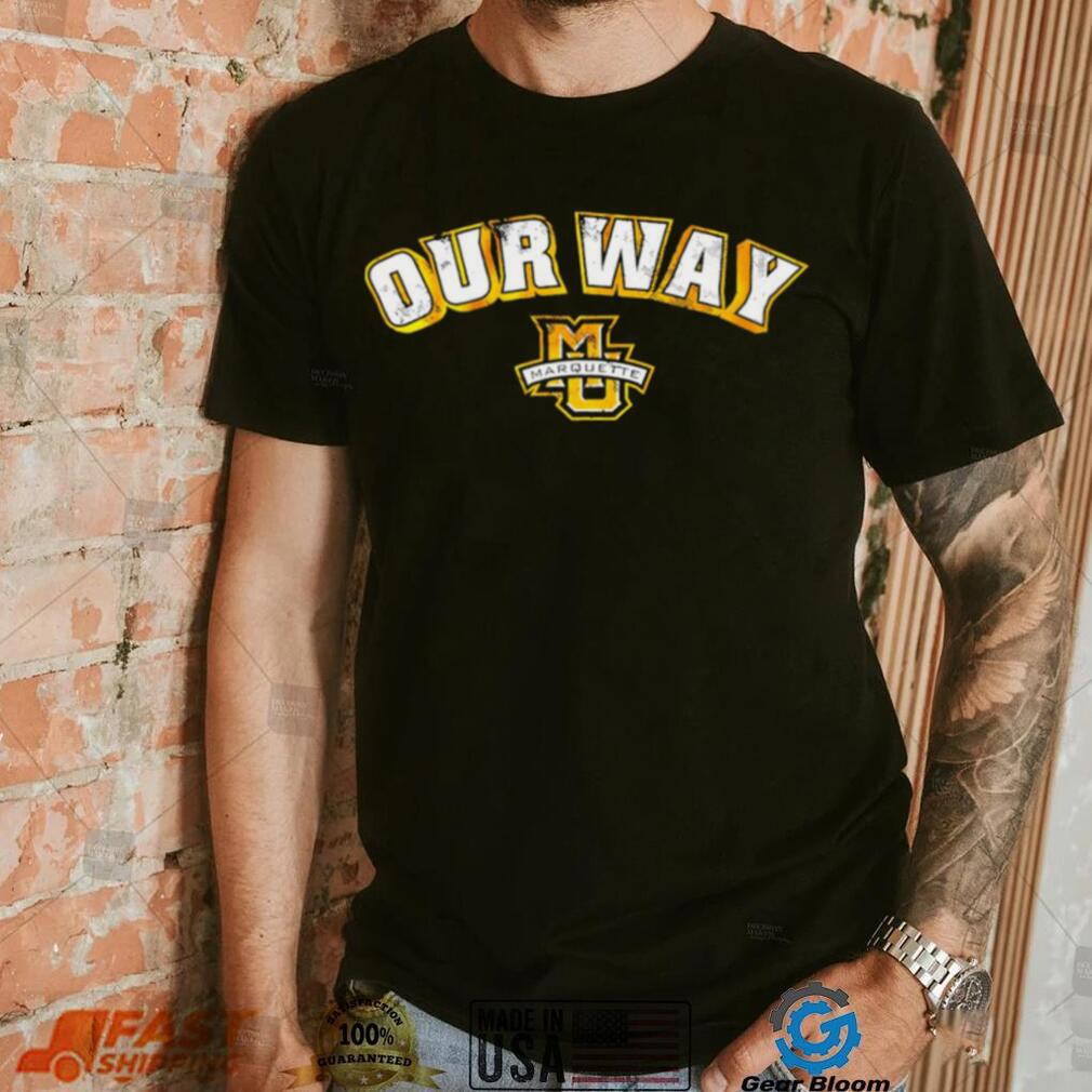 But with the spending you will increase the production of Marquette Golden Eagles basketball our way logo shirt. Either way, in the macroeconomy, “Spending” is what leads to wealth production, “not spending” reduces wealth production and does nothing to increase money saved. That money saved will exist whether used for spending or not. So on either front, if the goal is to increase savings, and increase the net production of wealth, “not spending” is the wrong advice. “Not spending” will not increase the savings that is the preservation of investment, and it will likely not increase the net production of wealth, in fact it is more likely to decrease both. In the macro economy, “not spending” is more likely to have negative effect on the production of wealth and standard of living, than a positive one.