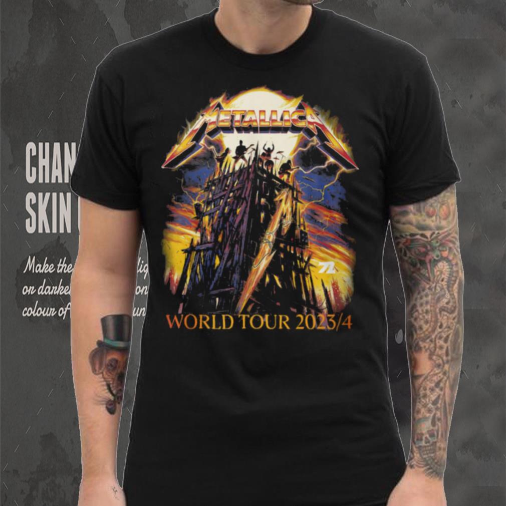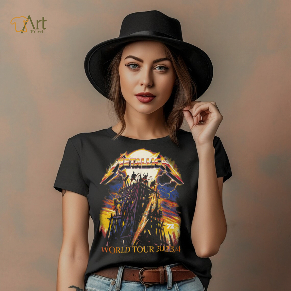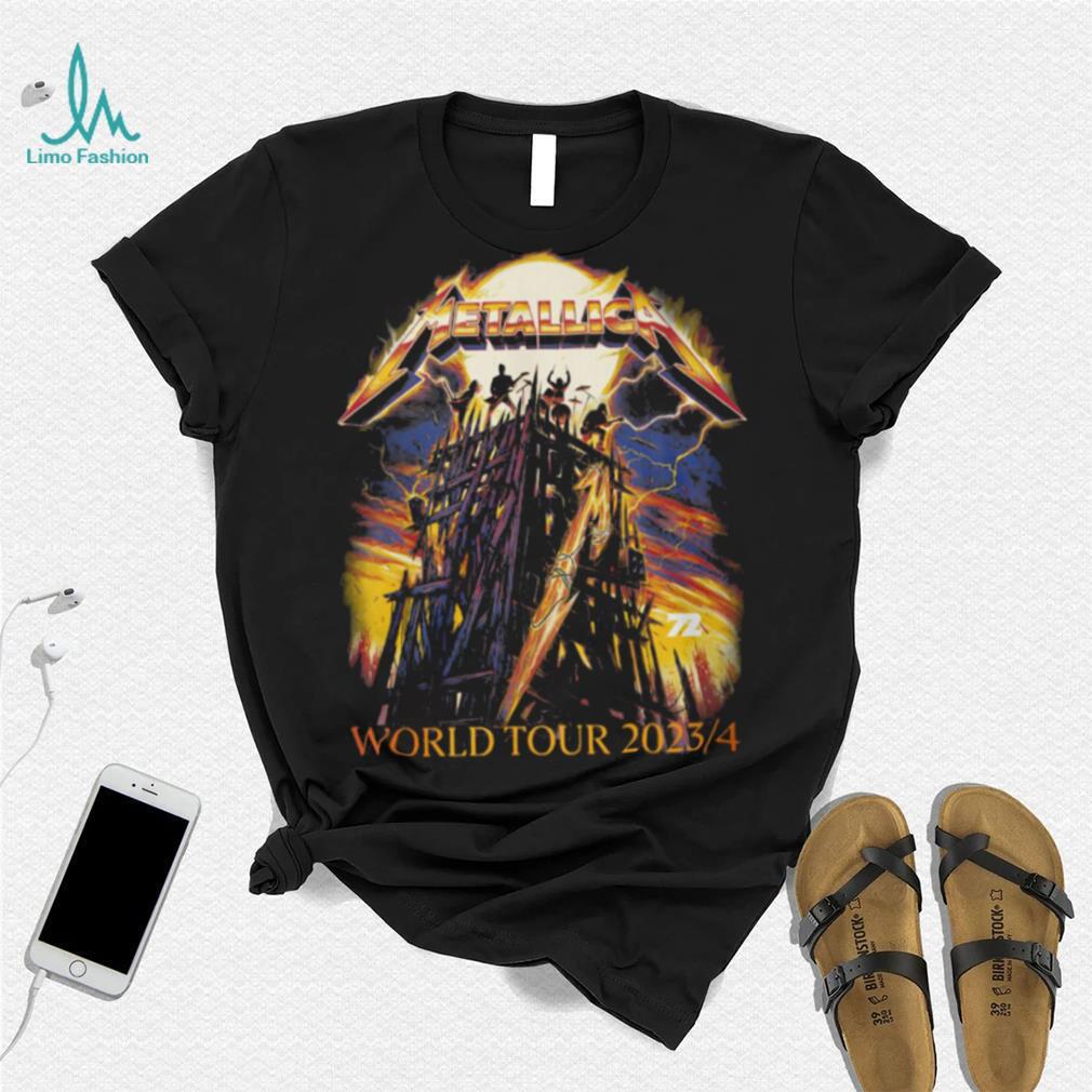I picked up Robin and it was a very cold night, snow was on the Merallicsa World Tour 2023 4 Shirt , the streets were empty of cars and people… as we set-out to find the Christmas tree. We spotted a lot, I did an illegal u-turn in my VW bug and drove up to the empty Christmas tree parking lot. The owner of the Christmas tree lot had abandoned the place and the fence gates were wide open. So we parked the car, and spent the next 30 minutes sorting through trees. Robin, was in the moment and we must have looked over at least thirty trees left behind for our pickings. I was coaching her in consideration how big of a Christmas tree we could actually fit into a VW Bug. We finally settled on a smaller Christmas tree that was propped up on a wooden stand and looked a little weak in the branch department, but not quite Charlie Brown style. I picked up the tree and moved it over to the VW bug, we had to drop the back seats, and aligned the tree between the two front seats…hey it smelled great in the car.